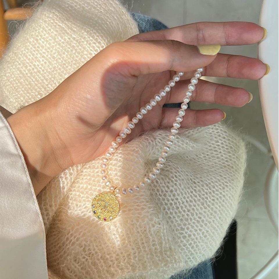 สร้อยคอผู้หญิงแบบเลเยอร์สุดอินเทรนด์ ประดับมุกธรรมชาติ สร้อยคอคล้องไหปลาร้า จี้เหรียญทองลายตาปีศาจ เครื่องประดับแฟชั่น
