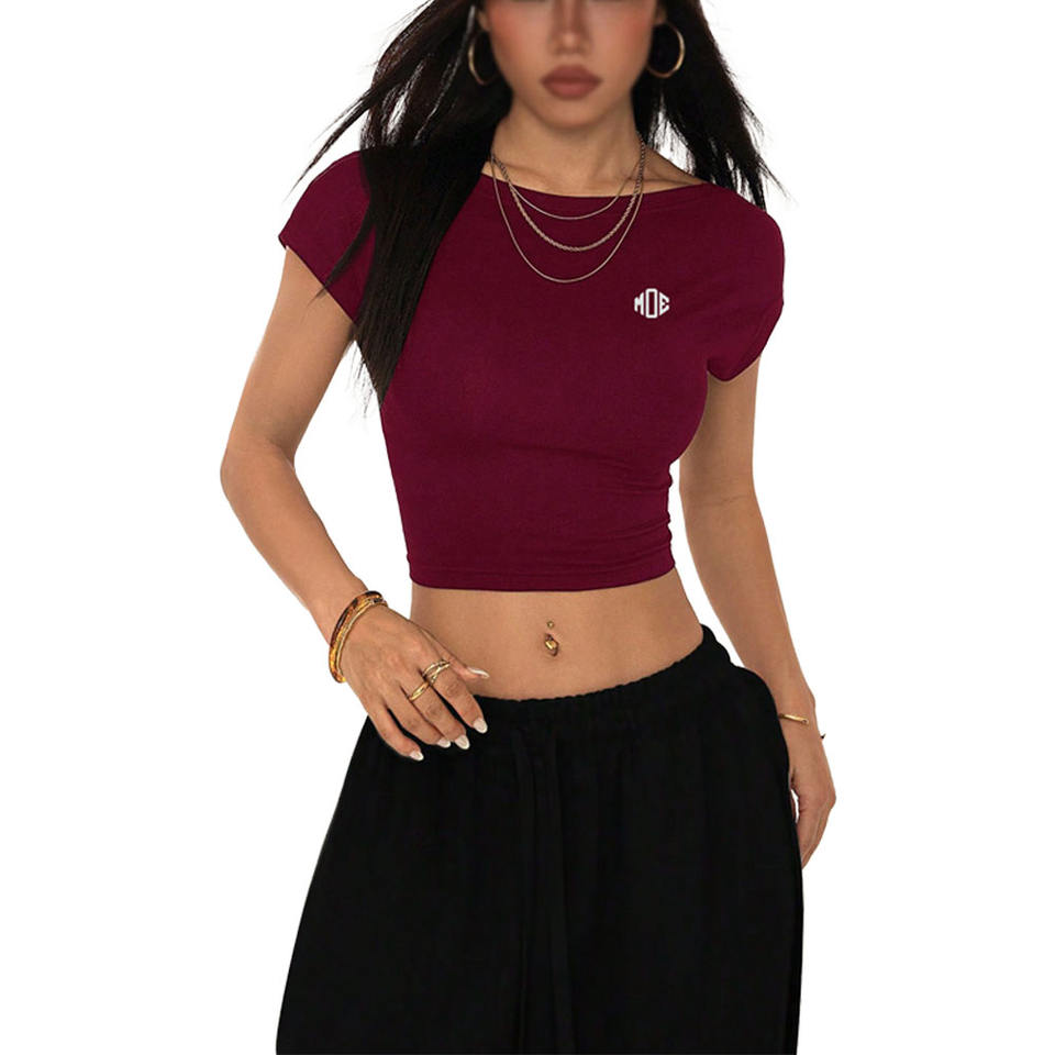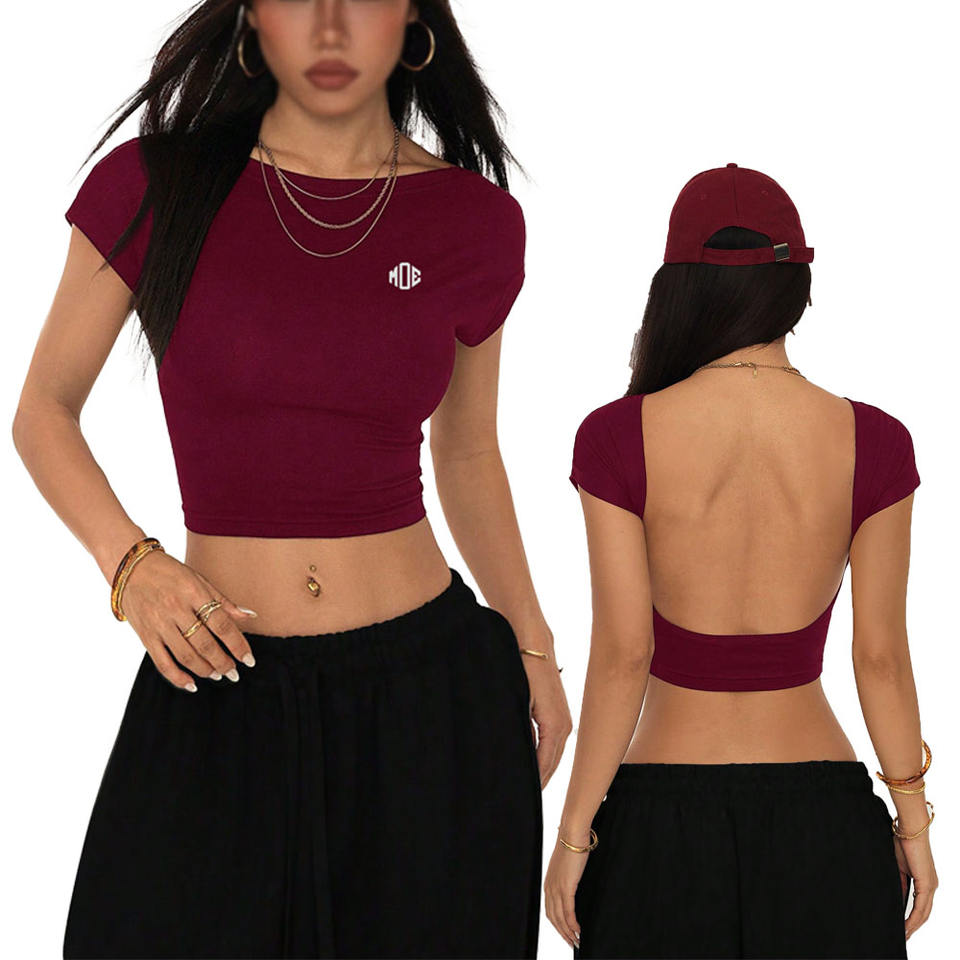 เสื้อครอปเปิดหลังแฟชั่นสำหรับผู้หญิง ขายส่ง เสื้อยืดทรงเข้ารูป ยืดได้ สไตล์สตรีทแวร์ฤดูร้อน รับทำโลโก้ตามสั่ง ผู้ผลิตเสื้อยืด OEM เสื้อผู้หญิง