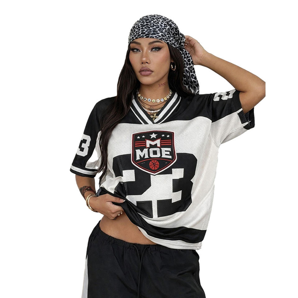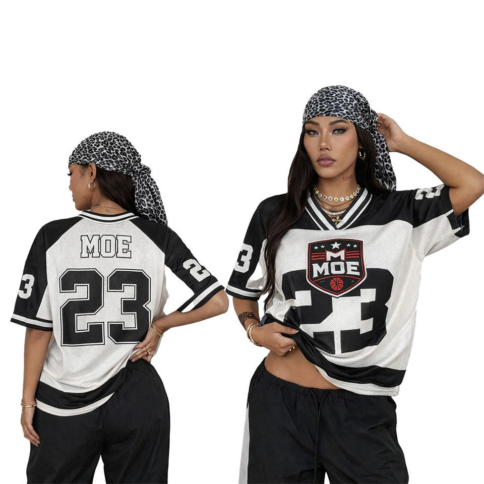 เสื้อยืดลำลองคอวีพิมพ์ลายฤดูร้อนสำหรับผู้หญิงทันสมัย ไซส์พลัส เสื้อเจอร์ซีย์ลายกราฟิก สตรีทแวร์ เสื้อเจอร์ซีย์อเมริกันฟุตบอล ผู้ผลิต OEM