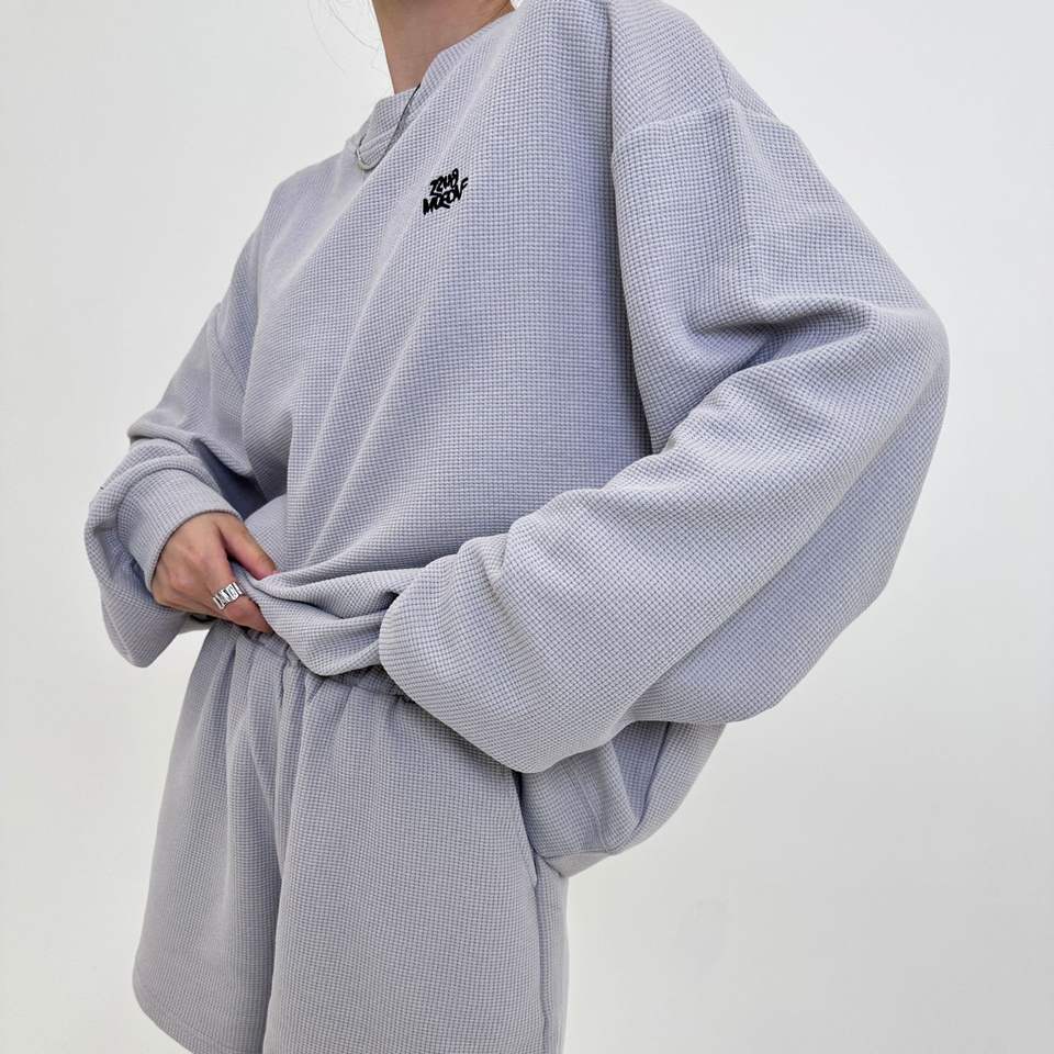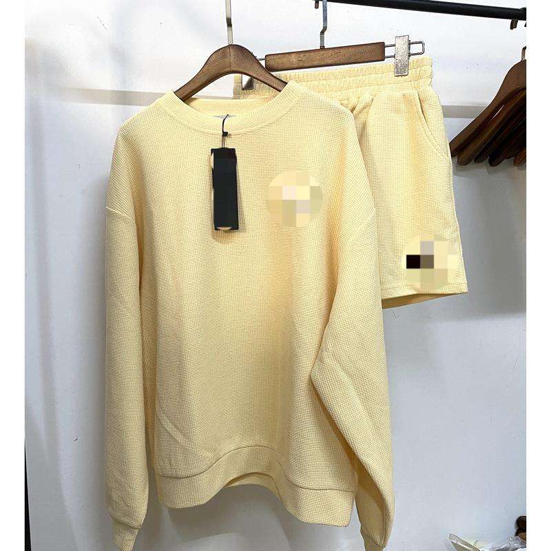 ชุดสูทฤดูร้อนสำหรับผู้หญิงผ้า100% วาฟเฟิลสีเทากางเกงกีฬาขาสั้นทรงหลวมพิมพ์ลายตัวอักษรผ้าถักแบบลำลอง