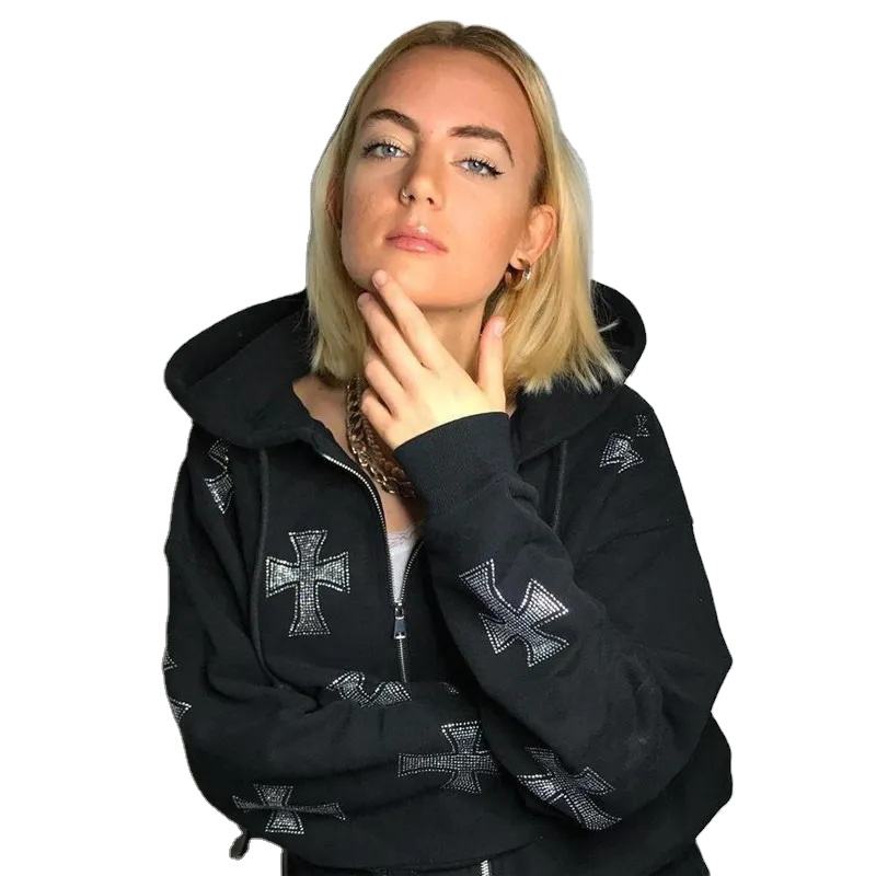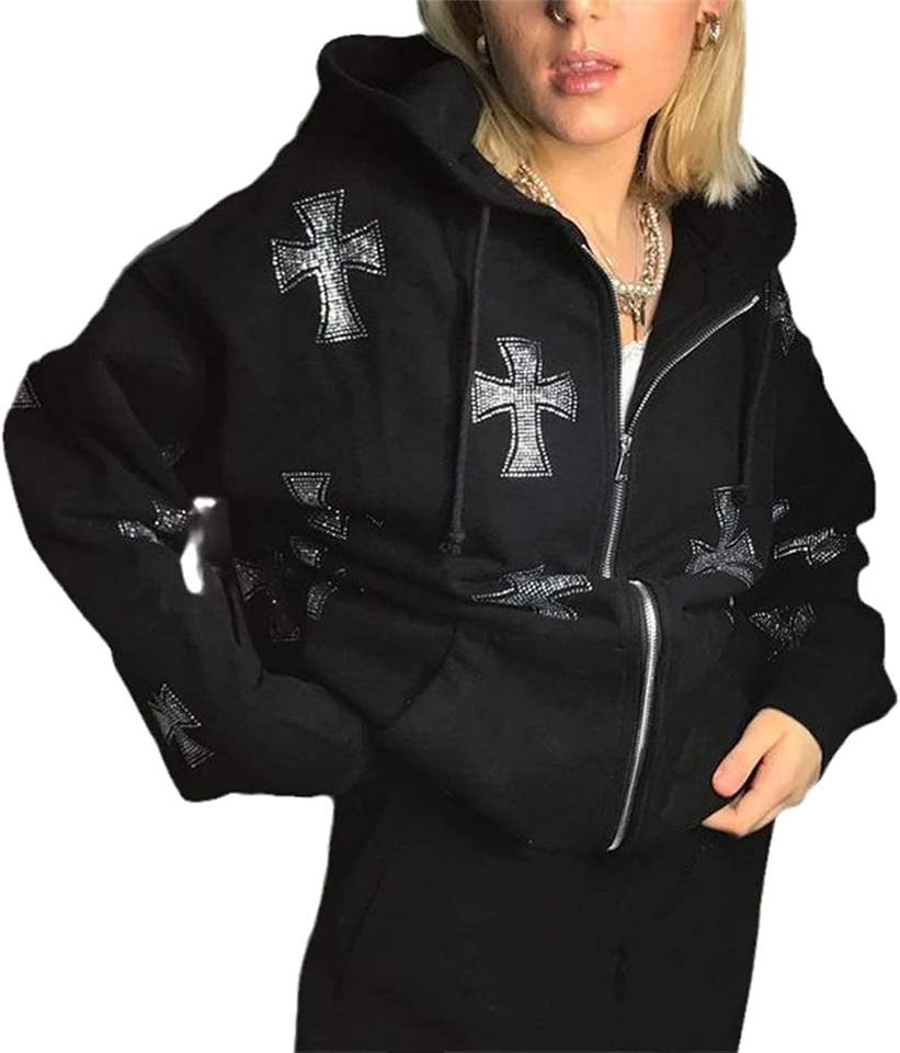 Trendy Women's Zip up Rhinestone Cross Oversized Hoodies Comfortable Breathable Casual Wear Winter Hoodies For Women