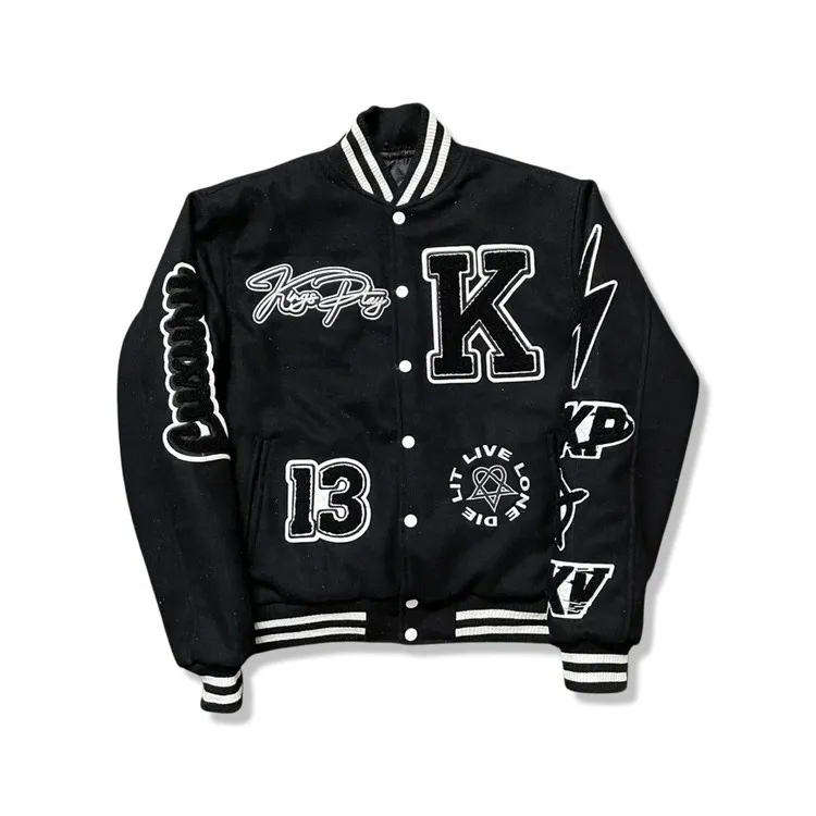 แจ็คเก็ตวาร์ซิตี้ลายกราฟฟิตีผ้าวูลเทรนดี้สำหรับผู้ชาย สไตล์ไฮสตรีท พร้อมปกเสื้อพับได้และแพทช์ปัก