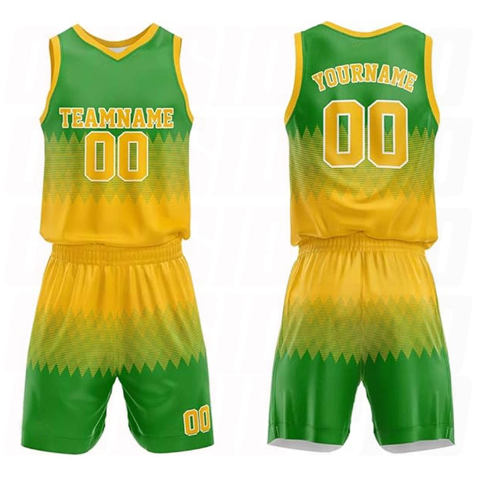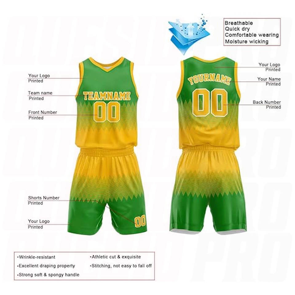 ชุดบาสเก็ตบอลสีเหลืองเขียวสุดเทรนดี้ ดีไซน์ล่าสุด ผ้าฝ้ายแห้งเร็ว ชุดยูนิฟอร์มบาสเก็ตบอลสั่งทำพิเศษสำหรับทีม