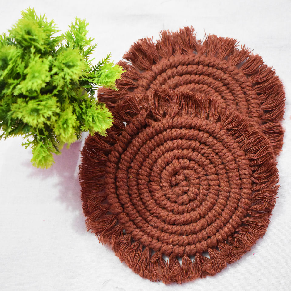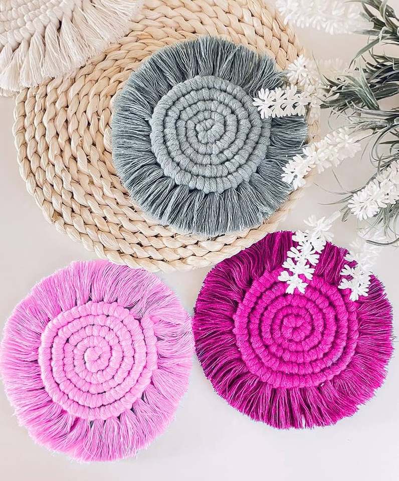 แผ่นรองแก้วมาคราเม่ทำมือสุดฮิต ดีไซน์สวยงาม ทรงกลม ป้องกันความร้อน กันลื่น ผลิตจากผ้าฝ้าย 100% สไตล์โบโฮ พร้อมพู่ห้อยสำหรับแก้ว