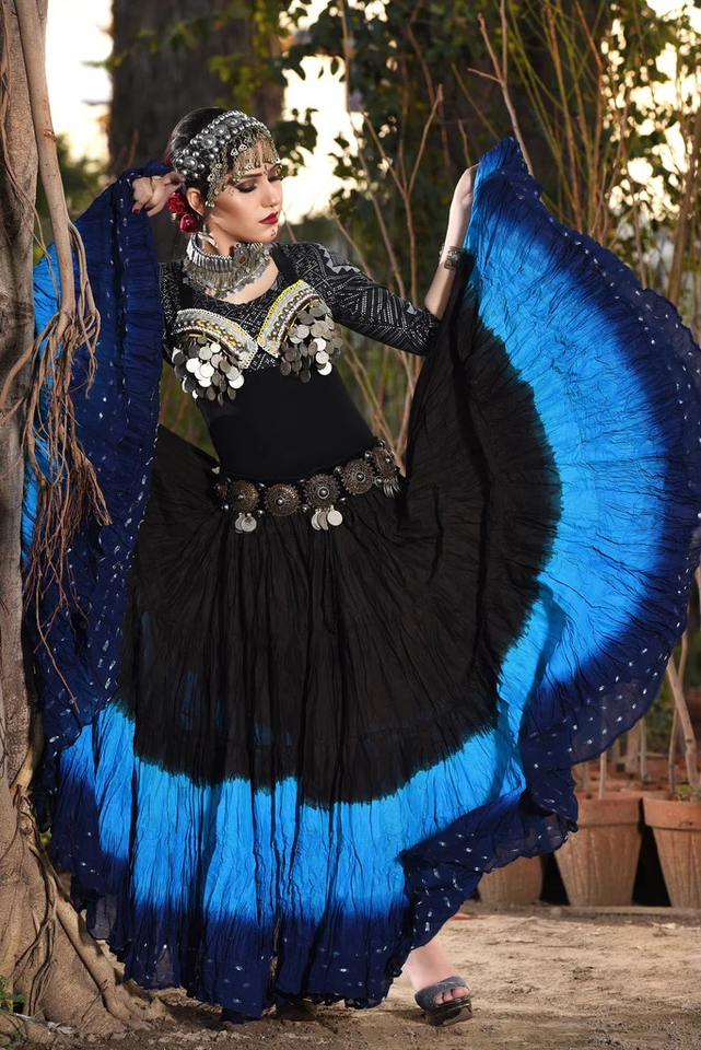 ชุดเต้นระบำหน้าท้องชนเผ่ากลุ่มยิปซี สีดำ-น้ำเงินไล่เฉด กระโปรงบานประดับเหรียญโลหะ เครื่องประดับศีรษะชนเผ่า