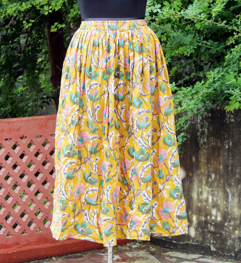 กระโปรงแมกซี่ผ้าฝ้ายพิมพ์ลายบล็อกมือแบบดั้งเดิมสำหรับผู้หญิงระบายอากาศได้แบบเผ่ายาวแบบผูกเชือกแบบธรรมชาติ