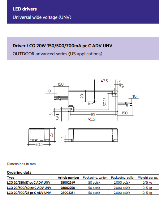 Tridonics 28002249ไฟ LED 20W แบบตัดเฟส350MA ที่ตั้งแห้งและชื้น