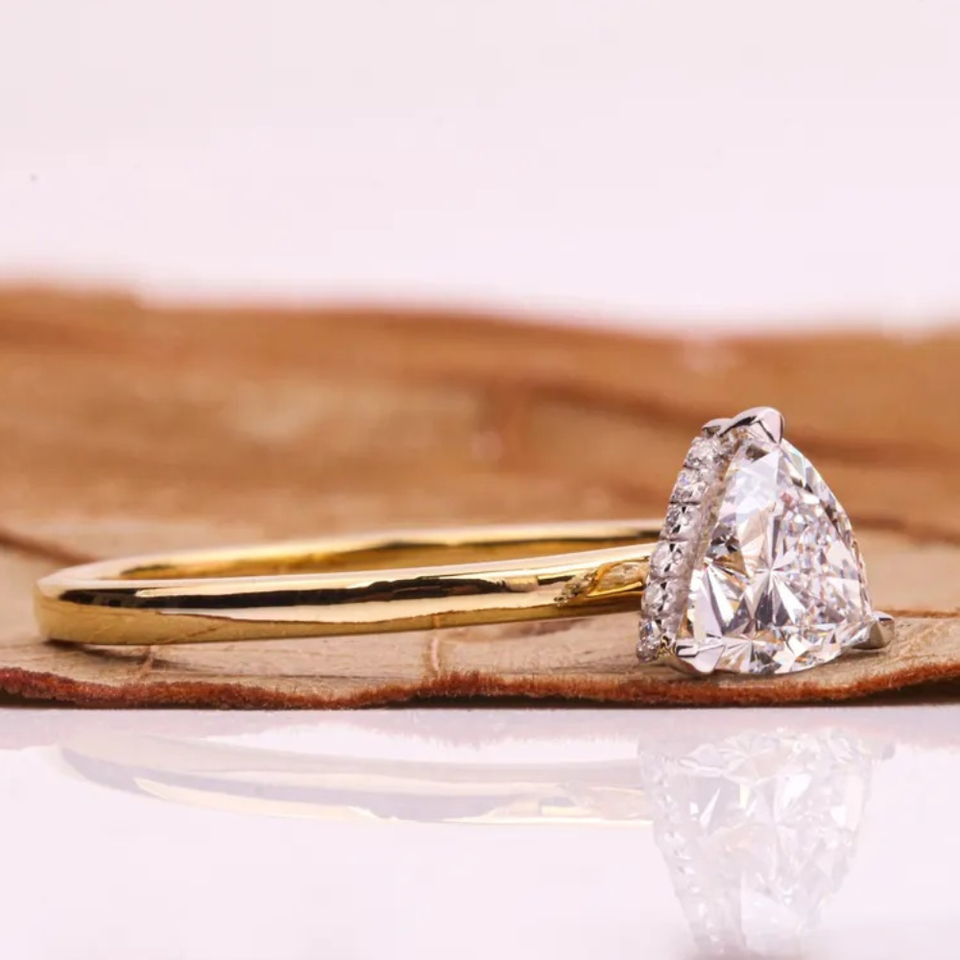 แหวนเพชรทรง Trillion Cut ขนาด 2 กะรัต แบบ Solitaire ประดับด้วย Halo ซ่อนอยู่ ตัวเรือนทอง 14K ชุบโรเดียม ดีไซน์หรูหราสำหรับผู้หญิง ทันสมัย สวยงาม