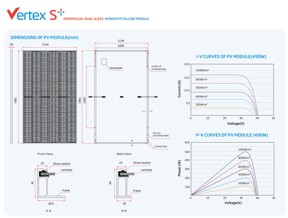 Neg18r ทริน่า28 EU Stock Vertex S + 480W 490W 495W 500W 505W biefacial PV โมดูลโซล่าร์เซลล์ triina สีดำทั้งหมด