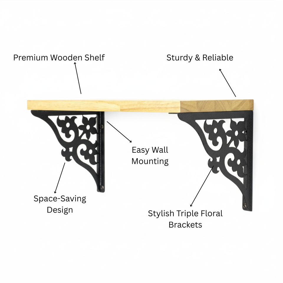 ชั้นวางของติดผนังไม้สีดำลายดอกไม้สามชั้นขนาดใหญ่ ดีไซน์หรูหรา สำหรับตกแต่งห้องนั่งเล่น ห้องนอน และสำนักงาน