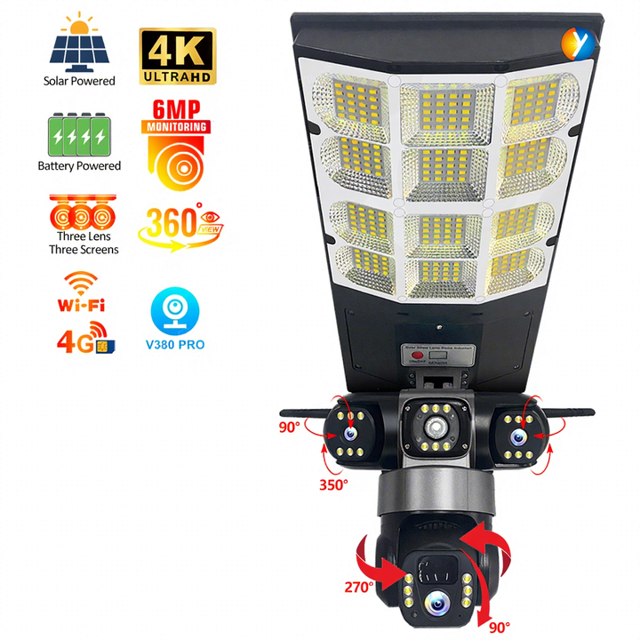 โคมไฟพลังงานแสงอาทิตย์แบบออลอินวันสามเลนส์พร้อมกล้อง4G ซิม WiFi โคมไฟพลังงานแสงอาทิตย์แบบออลอินวันพร้อมกล้องวงจรปิดพร้อม V380pro PIR
