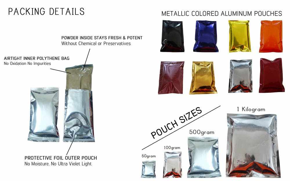 We at KEO have two types of Zipper pouch in 100-gram packing only in silver color. Packing size: 50, 100, 500 grams and 1 kg and 20kg to 25 kg Bulk Packing. Colored pouch available in 100-gram packing only. Packaging style: Double Layer Vacuum Packing (Vacuum Sealed LDPE Pouch + Composite Aluminum Foil Pouch). We have our in-house laboratory for testing the quality. Our natural hair colors, henna powder, and Indian herbs are Halal, GMP and ISO Certified. Besides that, we have MSDS, Lab test reports.