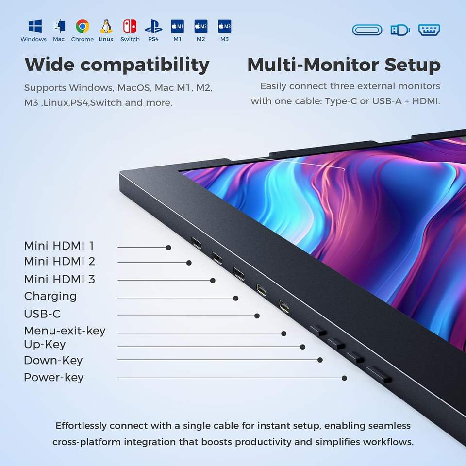 จอภาพพกพา OEM TriCreate ขนาด 14 นิ้ว แบบพับได้สามจอ สำหรับเล่นเกมส์ ความละเอียด 1080P Full HDR จอ LCD พร้อมพอร์ต USB แบบ IPS