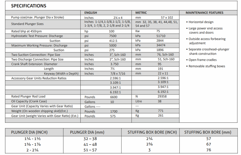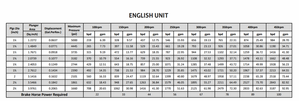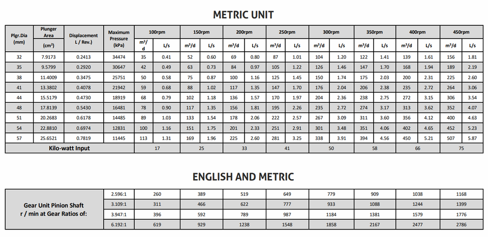 Displacement:3187 bpd (92.95 gpm) at 1660 psig 984 bpd (28.70 gpm) At 5000 psig