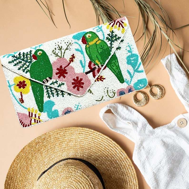 คลัทช์ลูกปัดนกเขตร้อน: กระเป๋าดอกไม้ทำมือตอนเย็น