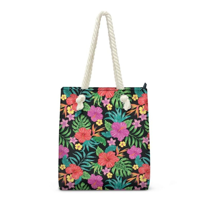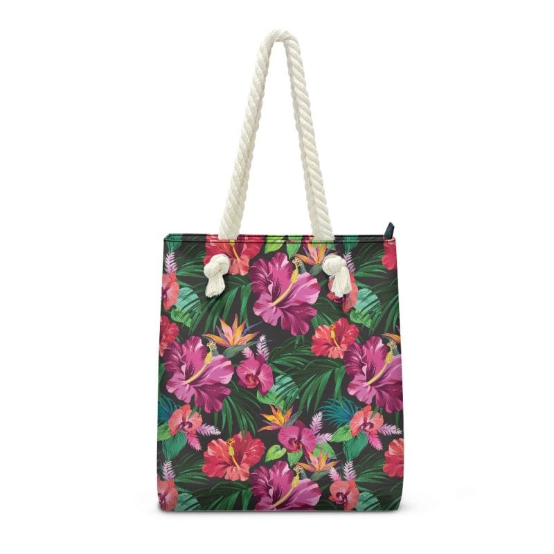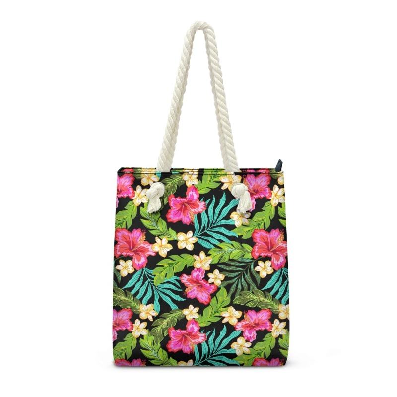 กระเป๋าโท้ทผู้หญิงแบบมีซิปปิดแบบลำลองมีเชือกผูกสำหรับชายหาดลายดอกชบาเขตร้อนทำจาก PU น้ำหนักเบา