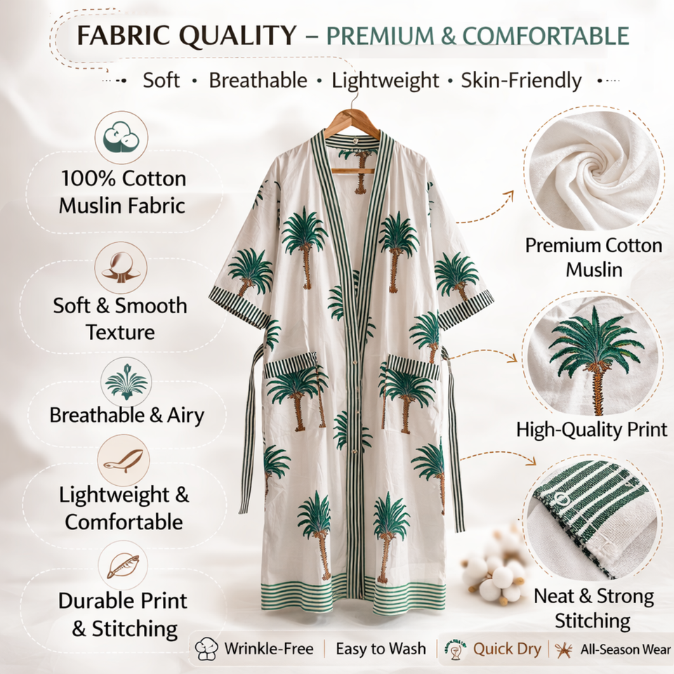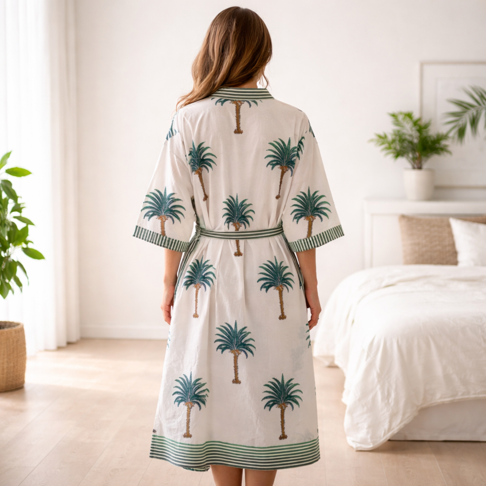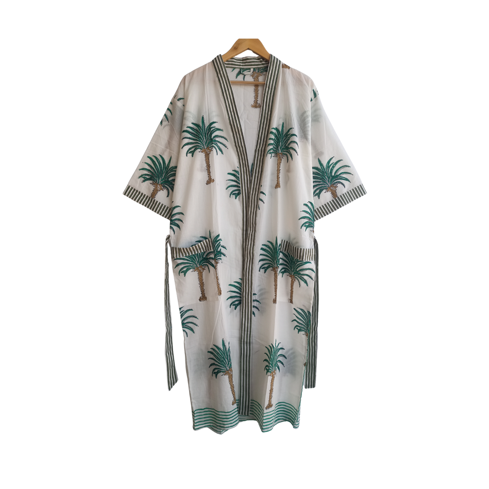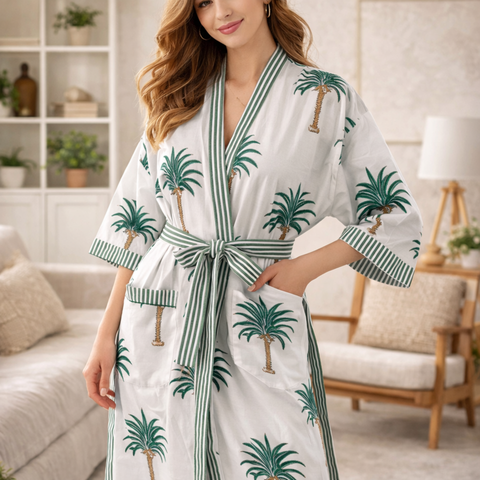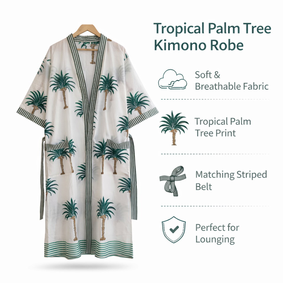ชุดกิโมโนผ้าฝ้ายลายใบปาล์มเขตร้อนสำหรับผู้หญิง คอวี แขนยาว แต่งขอบตัดสี มีกระเป๋า 2 ช่อง ชุดนอนลายพฤกษศาสตร์