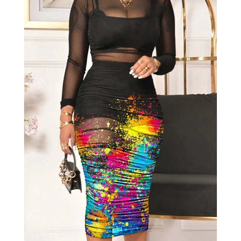 ชุดเดรสเซ็กซี่พิมพ์ลายทรอปิคอล แขนยาว คอเต่า ผ้าตาข่ายซีทรู แต่งระบายทรงดินสอ ไซส์พลัส ชุดเซ็ต 3 ชิ้น แฟชั่น