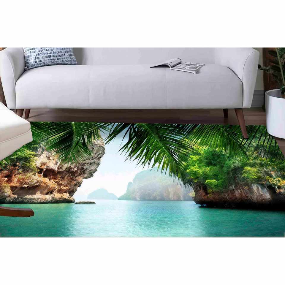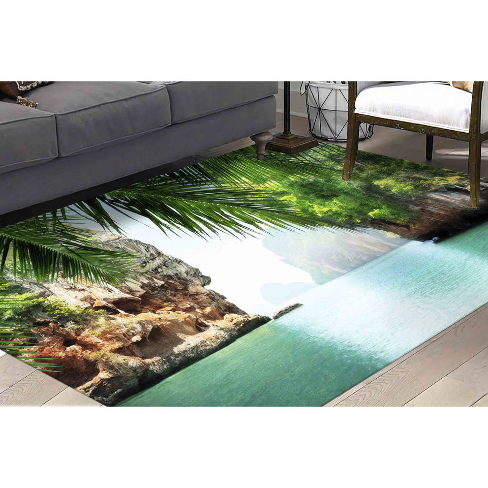 พรมลายวิวทะเลเขตร้อน: พรมปูพื้นลายทิวทัศน์ชายฝั่ง พรมพิมพ์ลาย พรมนุ่มแบบไม่ทอ