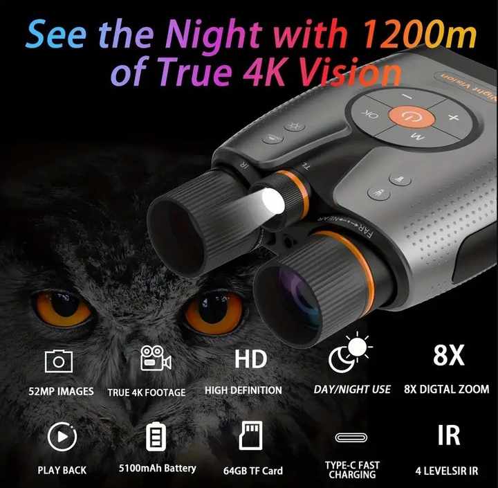 กล้องส่องกลางคืน True 4K พร้อม WiFi ควบคุมผ่านแอพสมาร์ทโฟน ใช้แสงอินฟราเรด 850 สำหรับมองเห็นในเวลากลางคืน ระยะ 1200 เมตร เหมาะสำหรับการดูสัตว์ป่าและการผจญภัยกลางแจ้ง