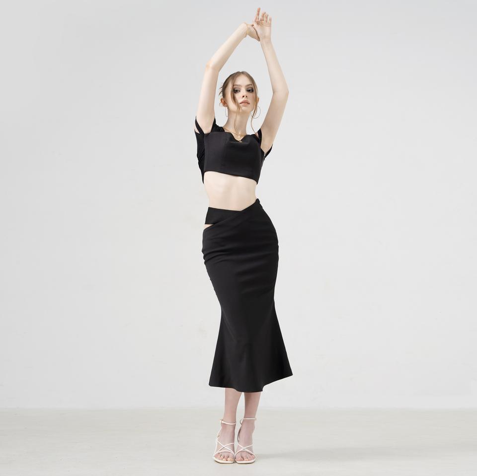 กระโปรงทรงนางเงือกผ้าคอตตอนสำหรับผู้หญิงกระโปรงแบบคัตเอาต์เอวต่ำพิมพ์โลโก้ดีไซน์ทรัมเป็ตสไตล์เวียดนาม