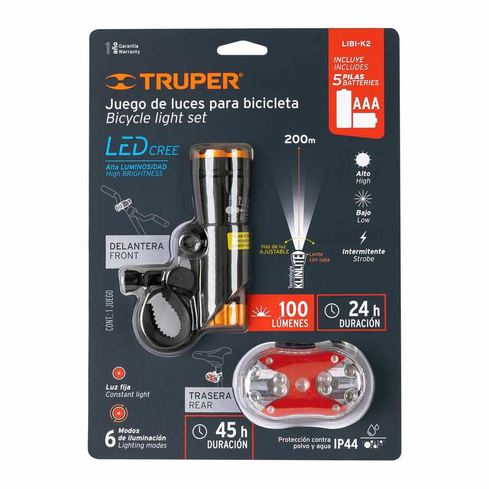 Truper LIBI-K2 Bicycle LED Light Kit Front Rear 2-Piece Aluminum Flashlights with Battery Power Supply Mounts on Frame Handlebar