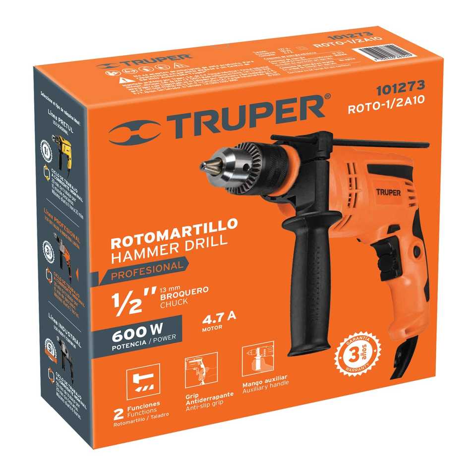 สว่านโรตารี่ไฟฟ้า Truper ROTO-1/2A10 600W ระดับมืออาชีพ พร้อมหัวจับดอกสว่าน SDS-Max สำหรับเจาะคอนกรีตและงานก่ออิฐ 2 ระดับความเร็ว 4 หัว