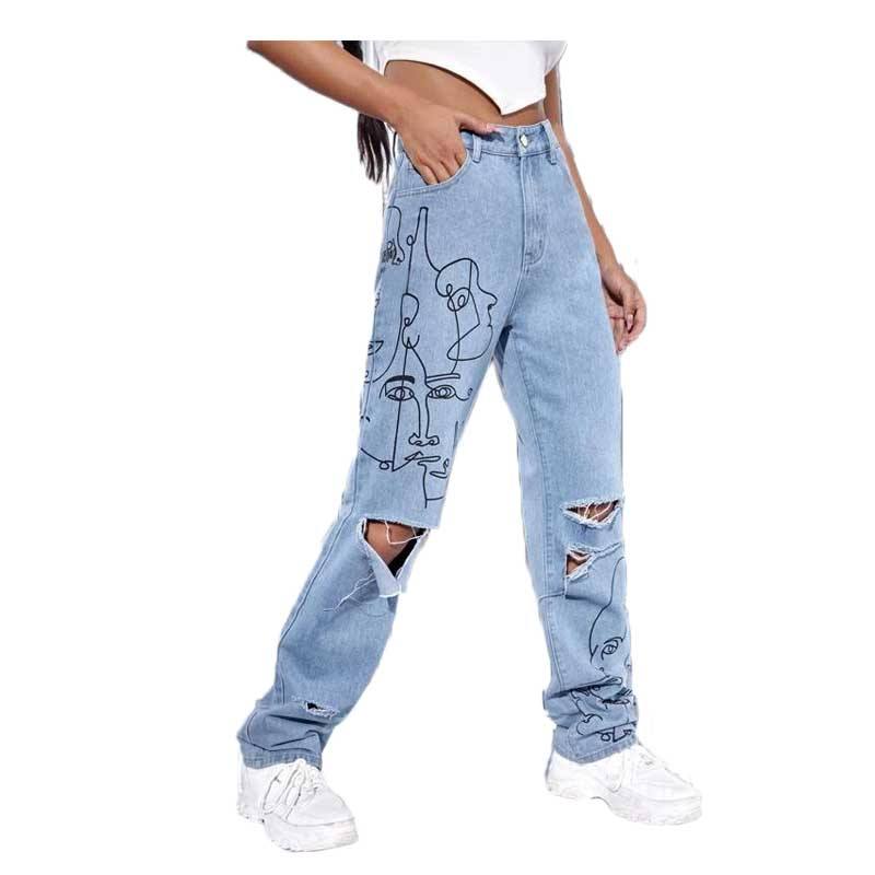 กางเกงยีนส์ทรงตรงขาตรงทรงหลวมสำหรับเด็กผู้หญิงผ้านุ่มลำลองแบบถักเอวสูง