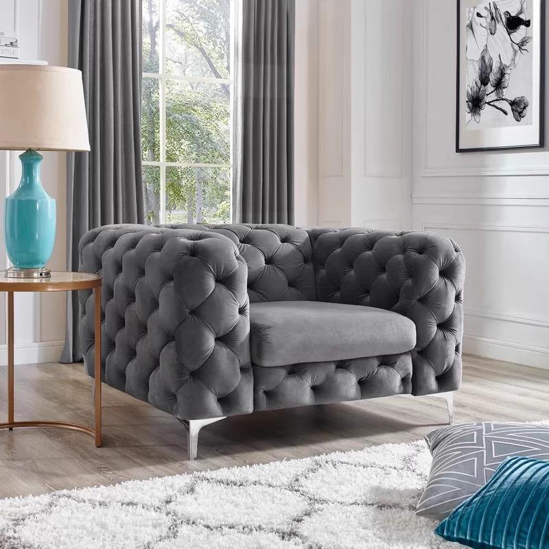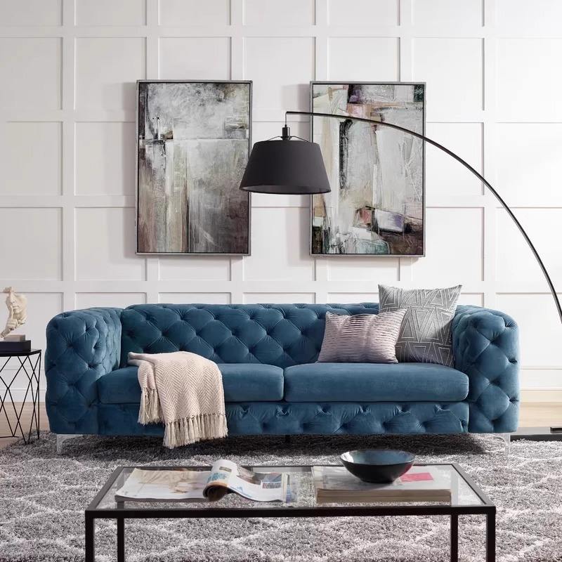 ชุดโซฟากำมะหยี่แบบกระจุกเฟอร์นิเจอร์ห้องนั่งเล่นสีฟ้าโซฟาออกแบบทันสมัยส่วนขนาดเต็มพร้อมหมอนและโต๊ะกาแฟ