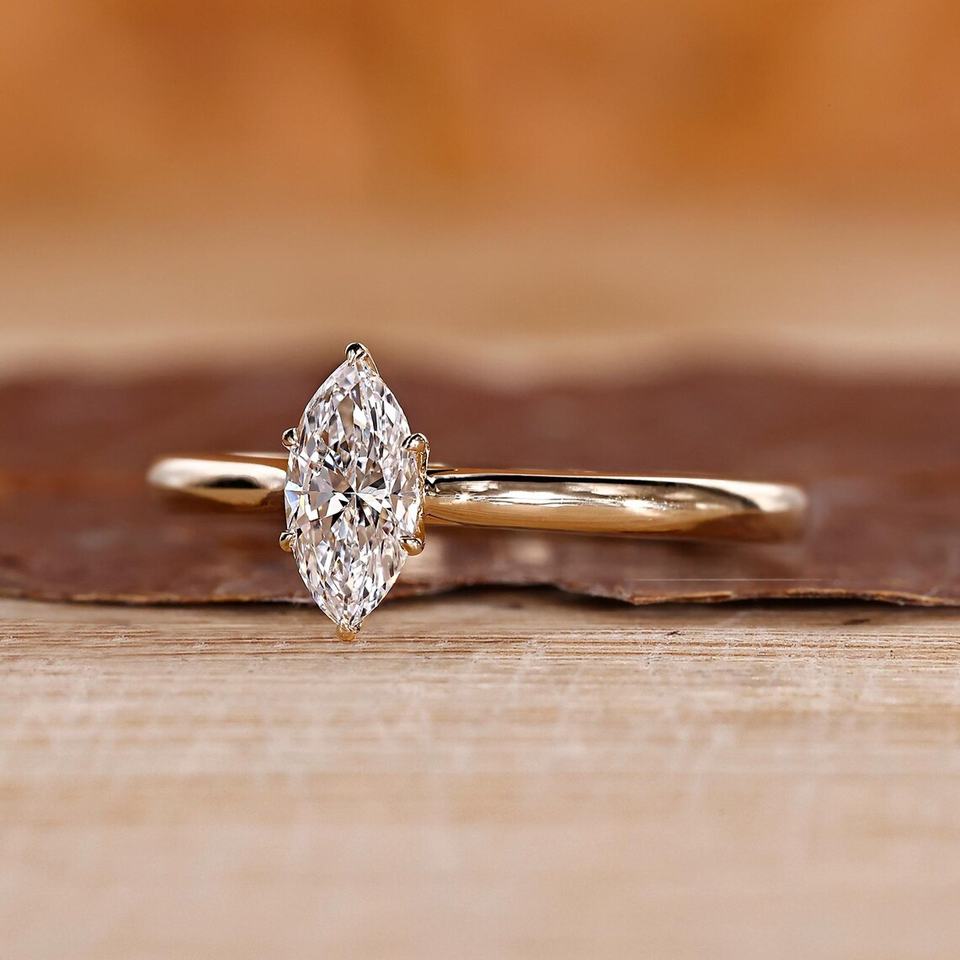 แหวนหมั้นและแต่งงานทรงดอกทิวลิปประดับเพชร CZ ทรงมาร์ควิส ดีไซน์เรียบหรู ตัวเรือนเงินแท้ 925 ชุบทอง แบบ 6 กรงเล็บ