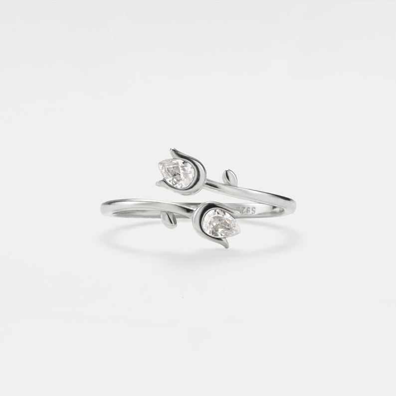 แหวนเงินแท้ 925 ชุบทอง ประดับเพชรโมอิสซาไนต์ทรงลูกแพร์ ดีไซน์ดอกทิวลิปซ้อนกัน ของขวัญสำหรับงานหมั้นหรืองานเลี้ยง
