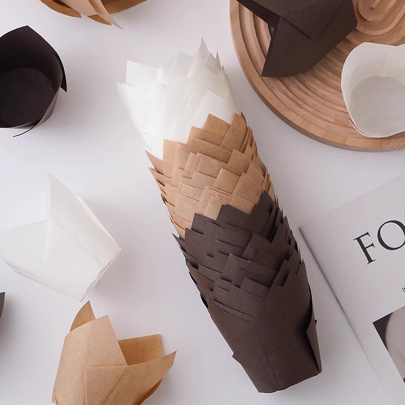 ถ้วยกระดาษลายดอกทิวลิปสำหรับใส่เค้ก กระดาษรองอบกันไขมัน สำหรับมัฟฟิน ใช้กับเตาอบได้ สีขาวธรรมชาติ สีน้ำตาล สีผสม น้ำหนัก 40 กรัม