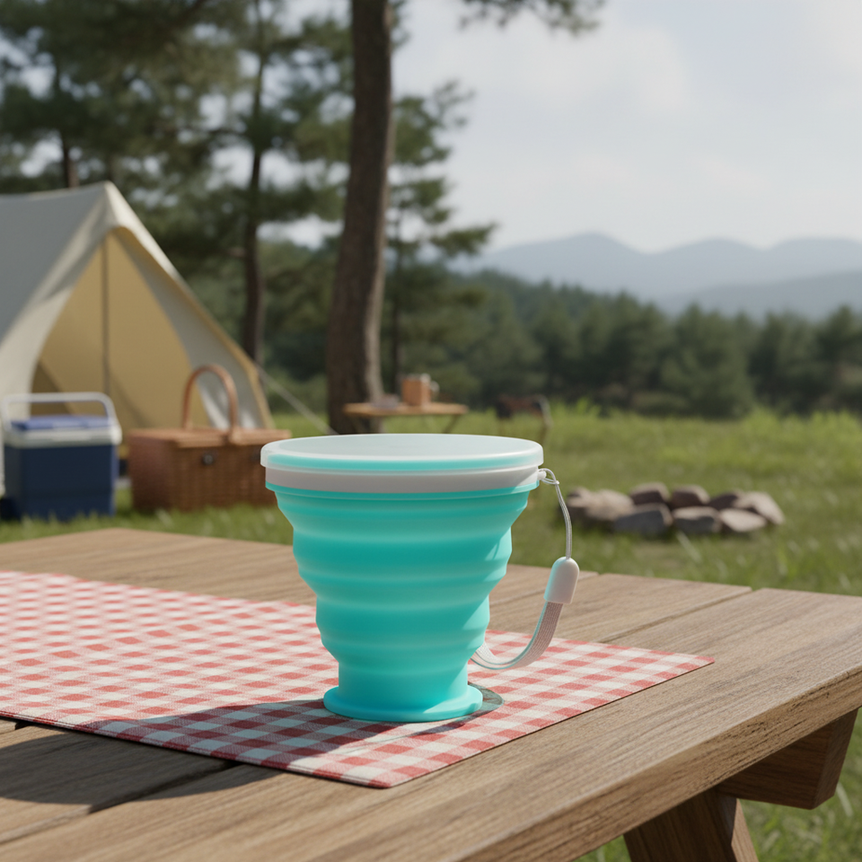 แก้วน้ำซิลิโคนพับได้พร้อมฝาปิดสำหรับการเดินทางกลางแจ้งสีดำร้อนและเย็น