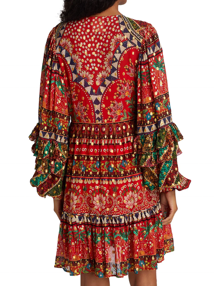 ชุดเดรสทูนิคสไตล์คอวีแขนยาวซิปข้างกระเป๋าวิสคอส/โพลีเอสเตอร์และเดรสโบฮีเมียนสั้นของผู้หญิง