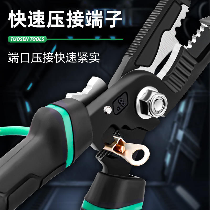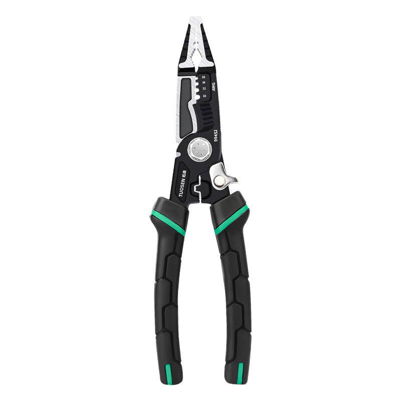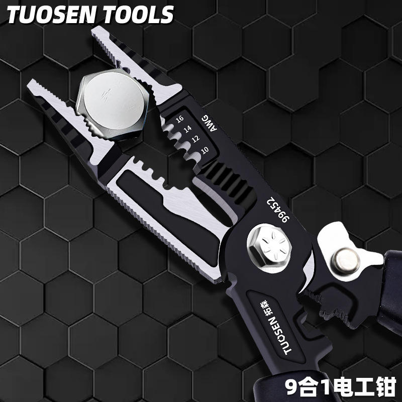 คีมช่างไฟฟ้า Tuosen 9 in 1 ทำจากเหล็กกล้าคาร์บอนสูง ใช้สำหรับปอกสายไฟ ตัด บีบ และมีปลายแหลม คุณภาพระดับอุตสาหกรรม