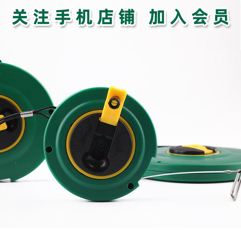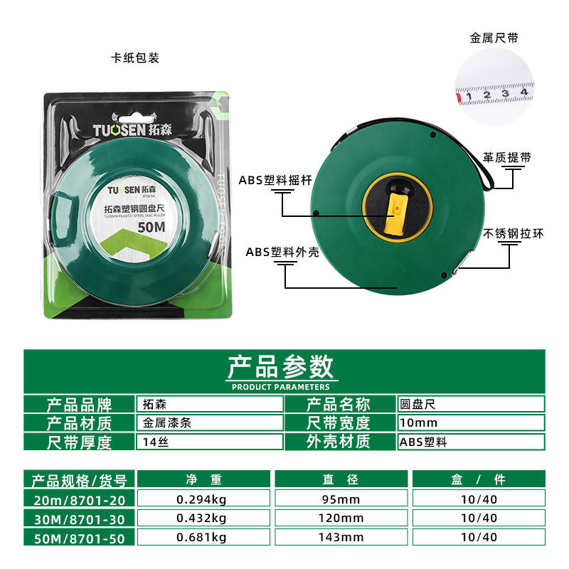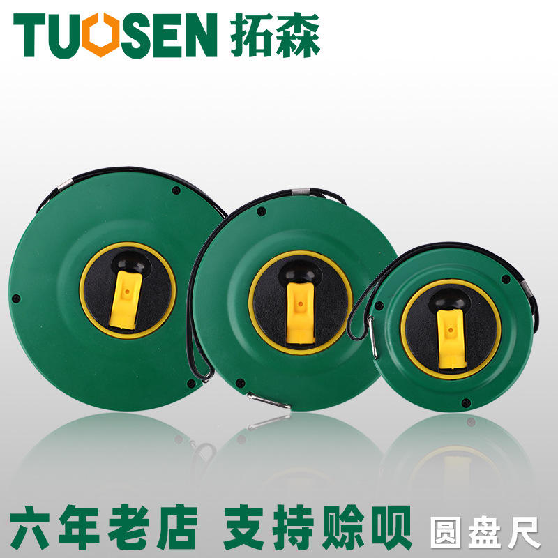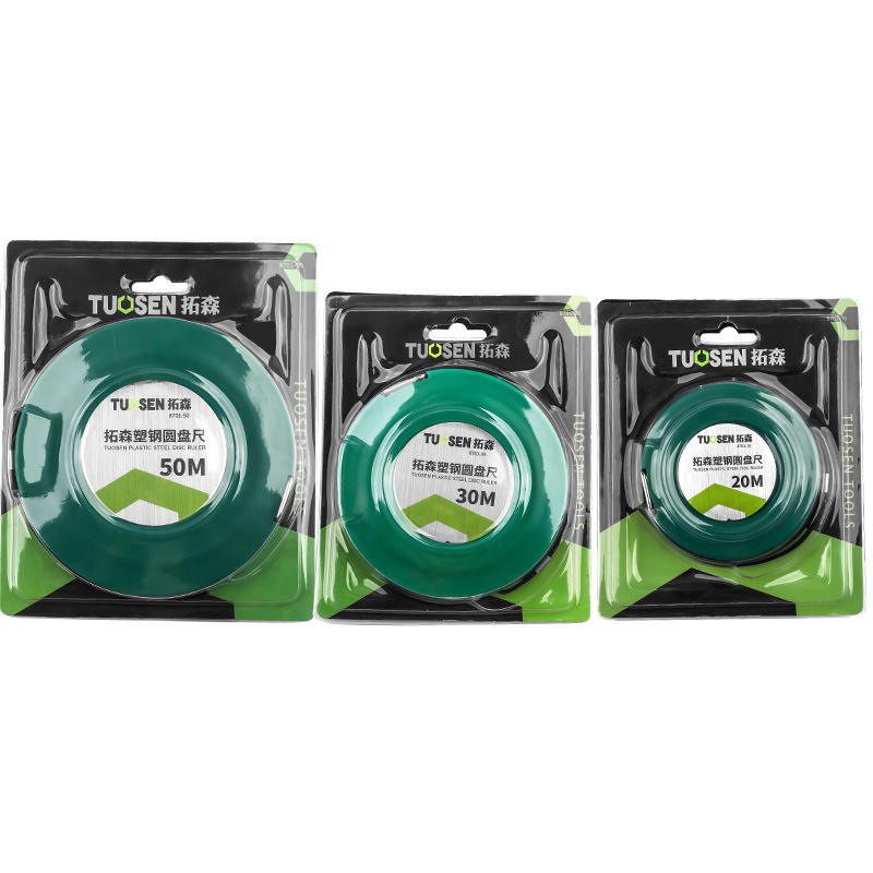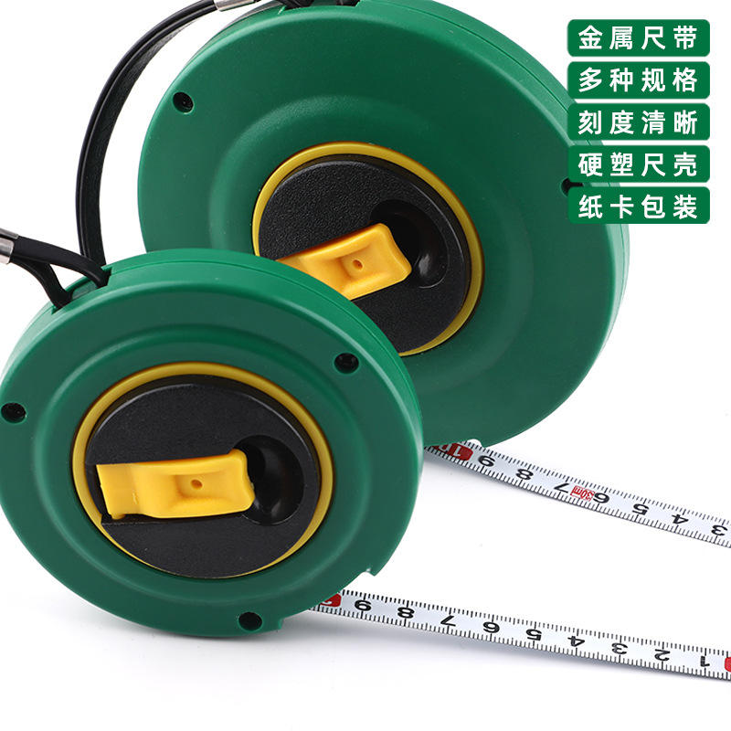 ตลับเมตรแบบม้วนเก็บอัตโนมัติ Tuosen ขนาด 20 เมตร ใบมีดเหล็กกล้า กลไกคืนตลับอัตโนมัติ ตัวเรือนทรงกลม แบบเมตริก