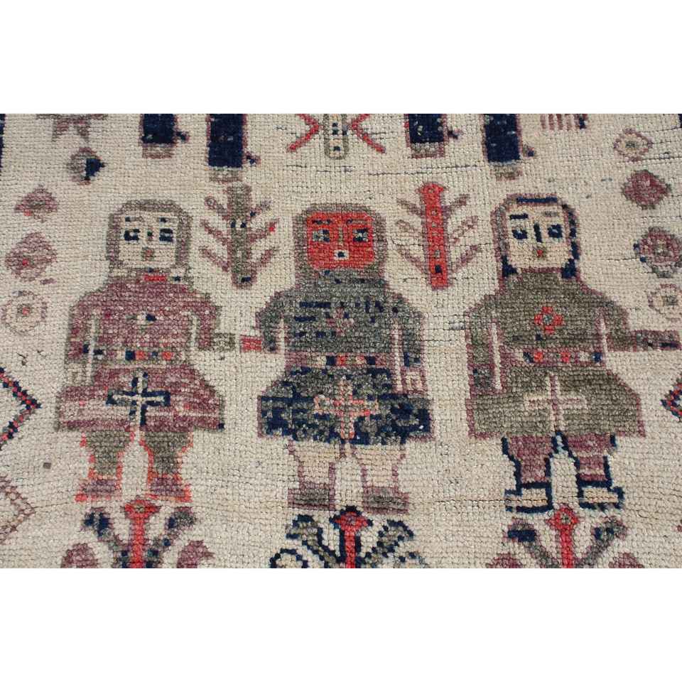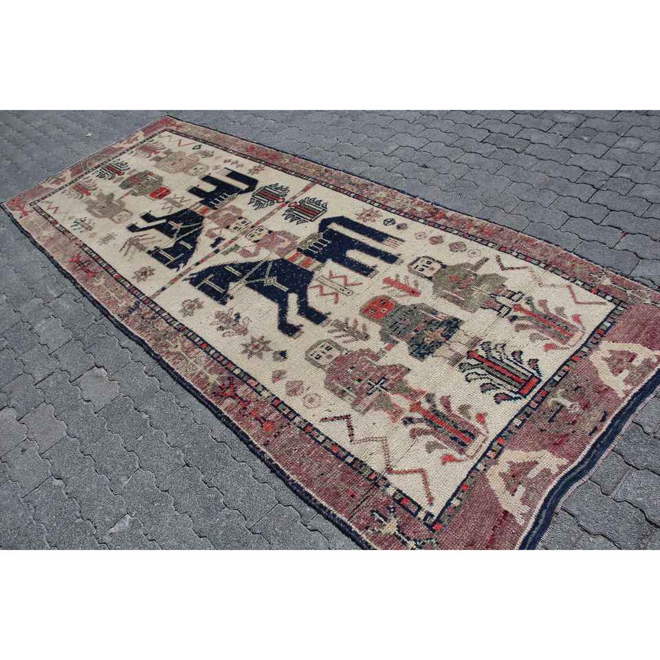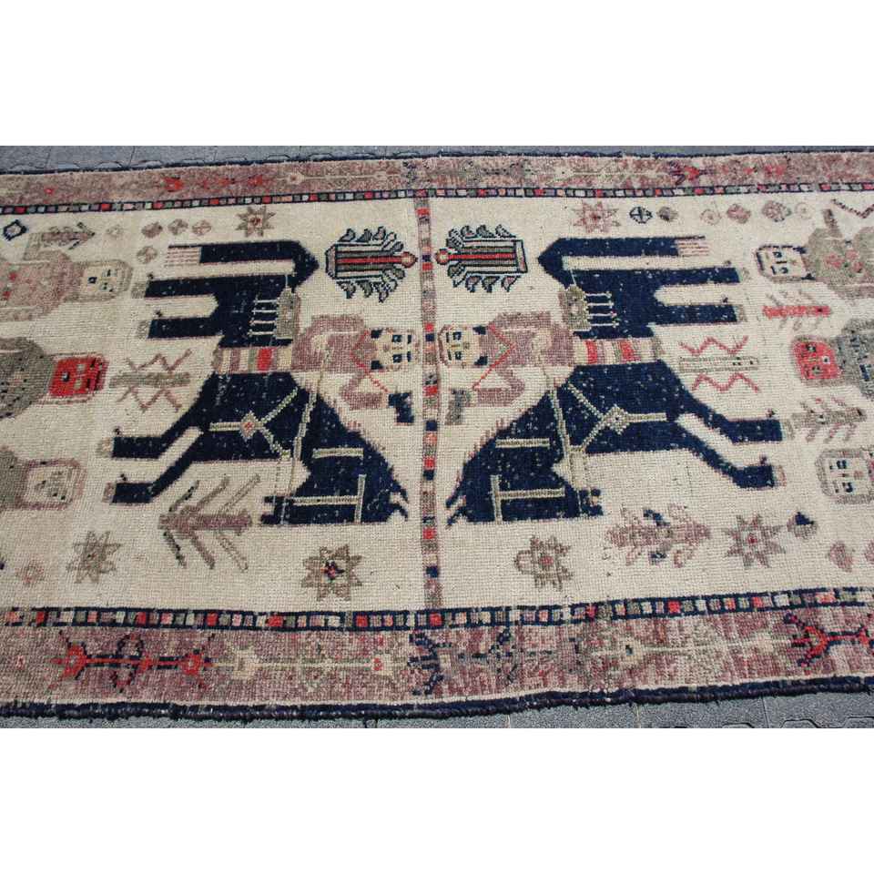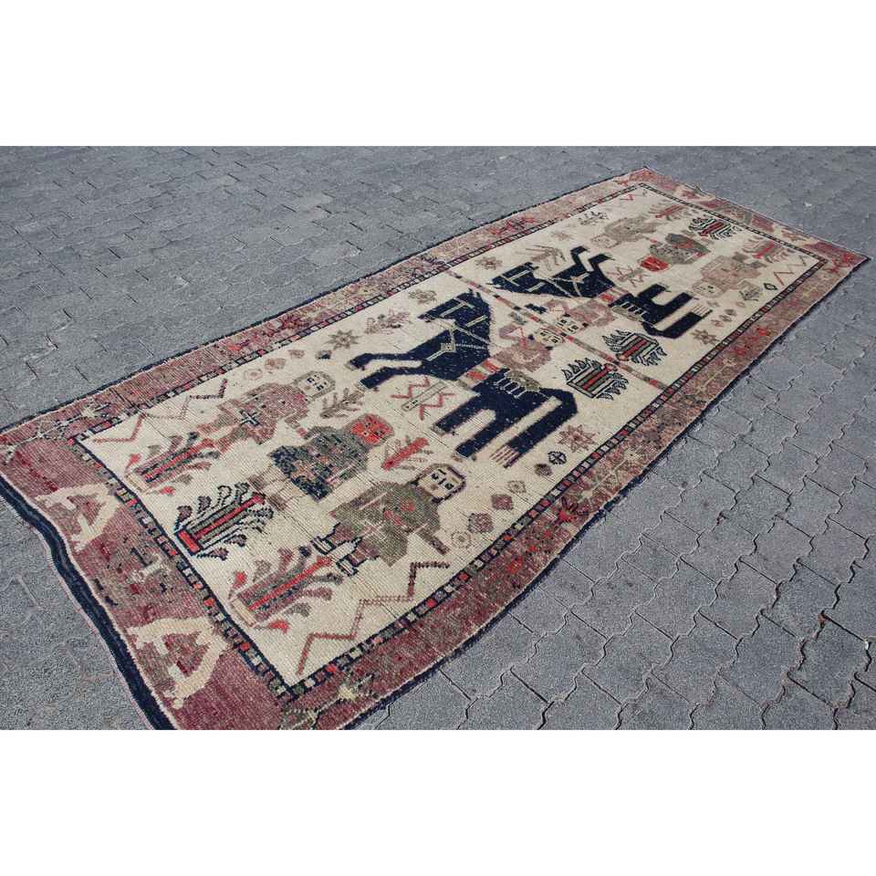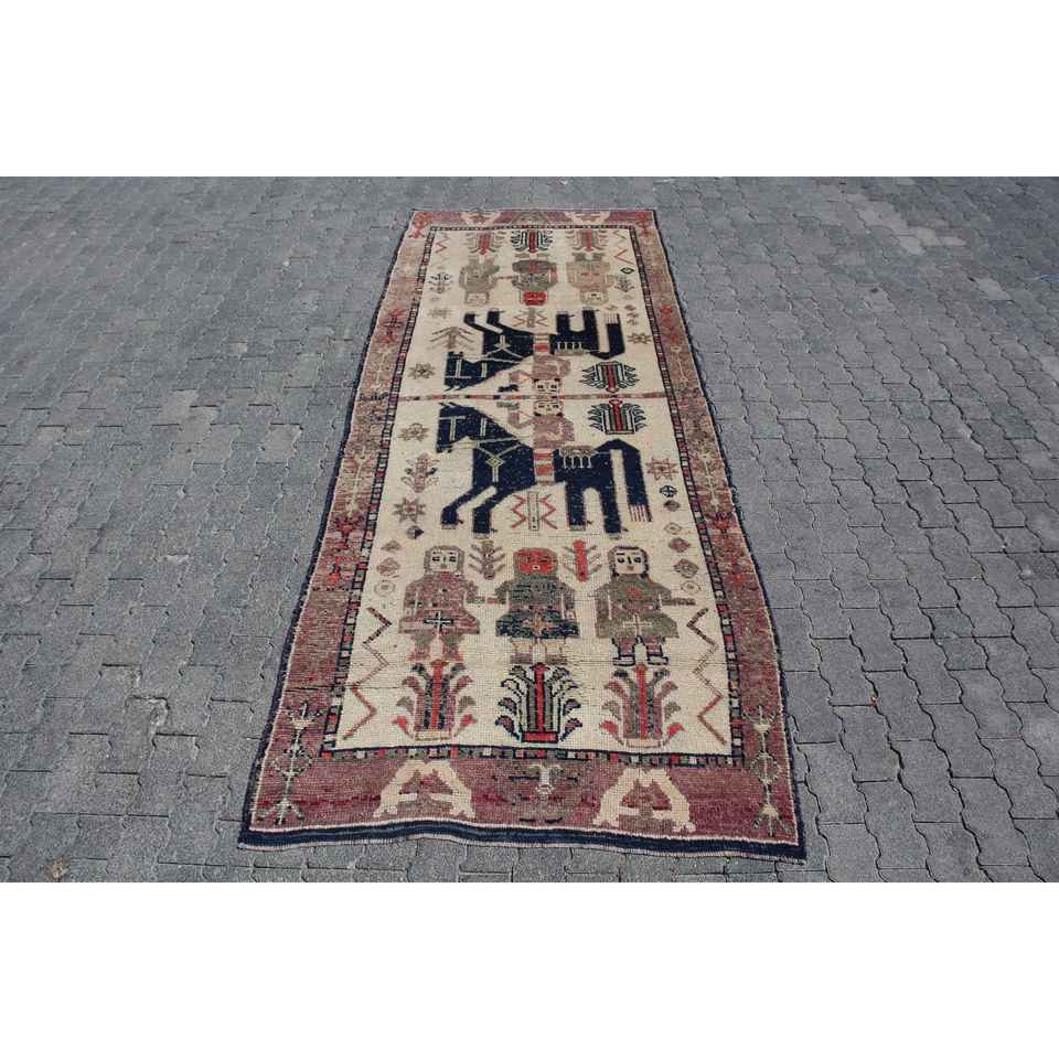 พรมตุรกีขนาด 4x10.7 ฟุต, พรมเฮอร์กีวินเทจ, พรมขนสัตว์ลายพิมพ์สัตว์สีแดง