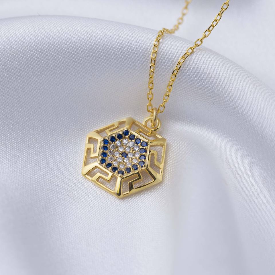 สร้อยคอจี้รูปทรงหกเหลี่ยมลายตาตุรกีแบบกรีก งานแฮนด์เมดจากตุรกี ขายส่งเครื่องประดับเงินแท้ 925