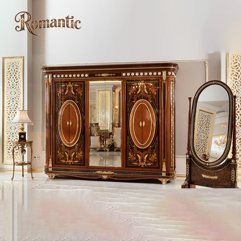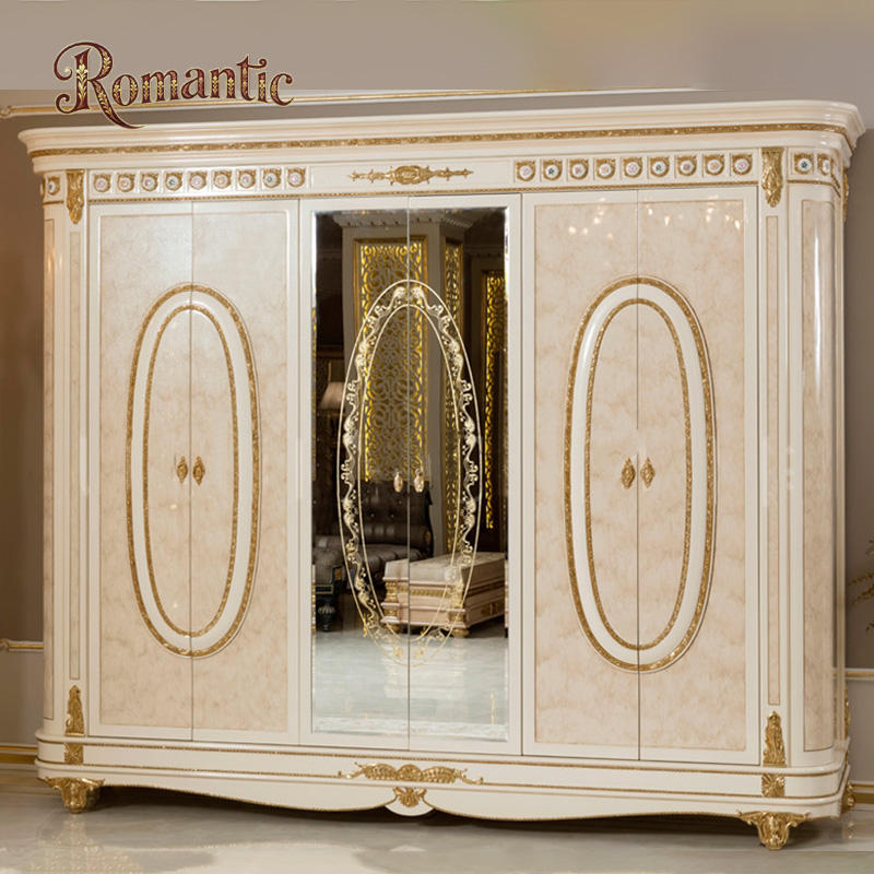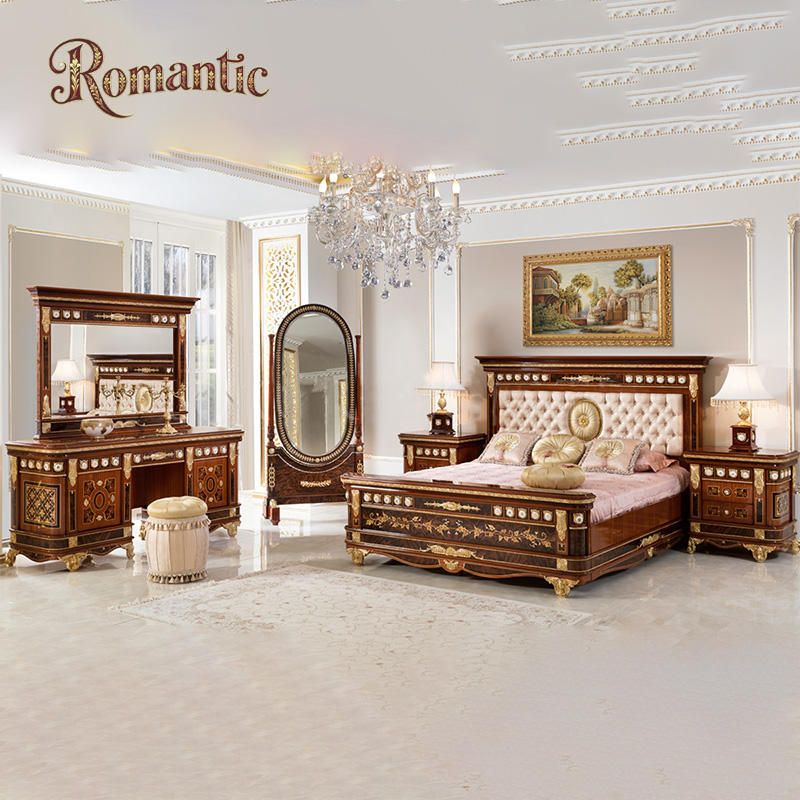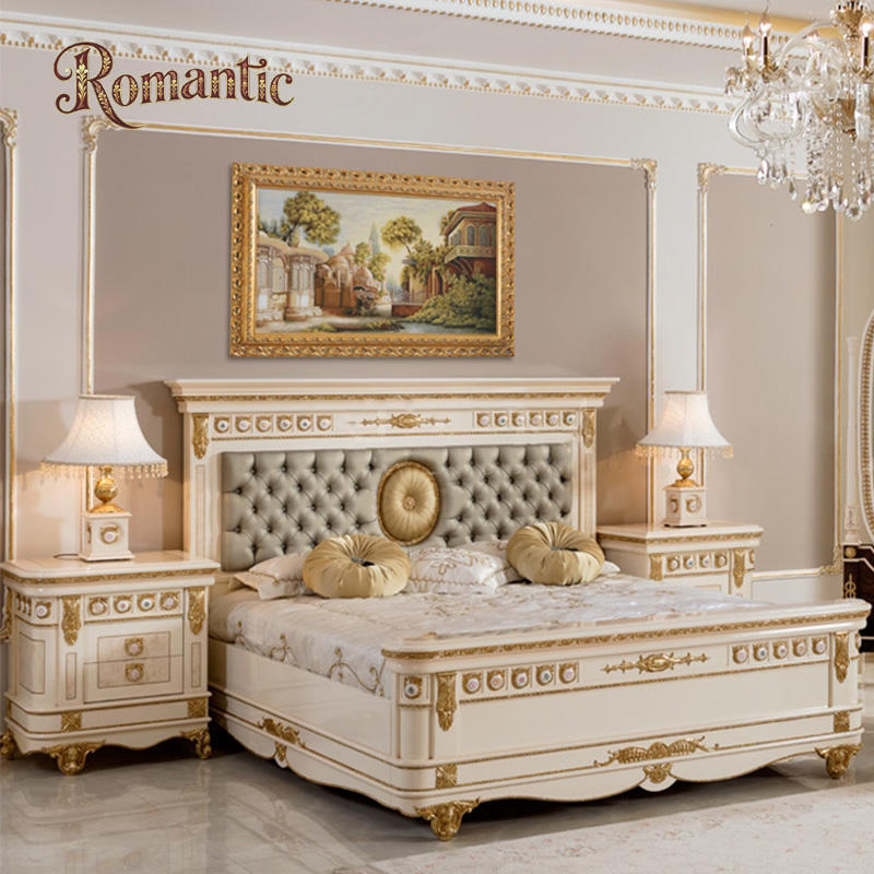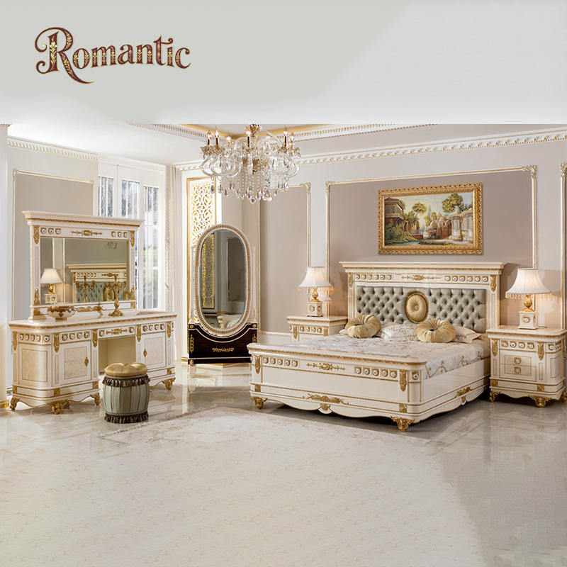 โครงเตียงไม้เนื้อแข็งสีขาวสไตล์หรูหราแบบตุรกี ขนาดใหญ่ สำหรับเตียงคู่ แบบวินเทจ ขนาดควีนไซส์ สีทอง พร้อมชุดเฟอร์นิเจอร์ครบชุด
