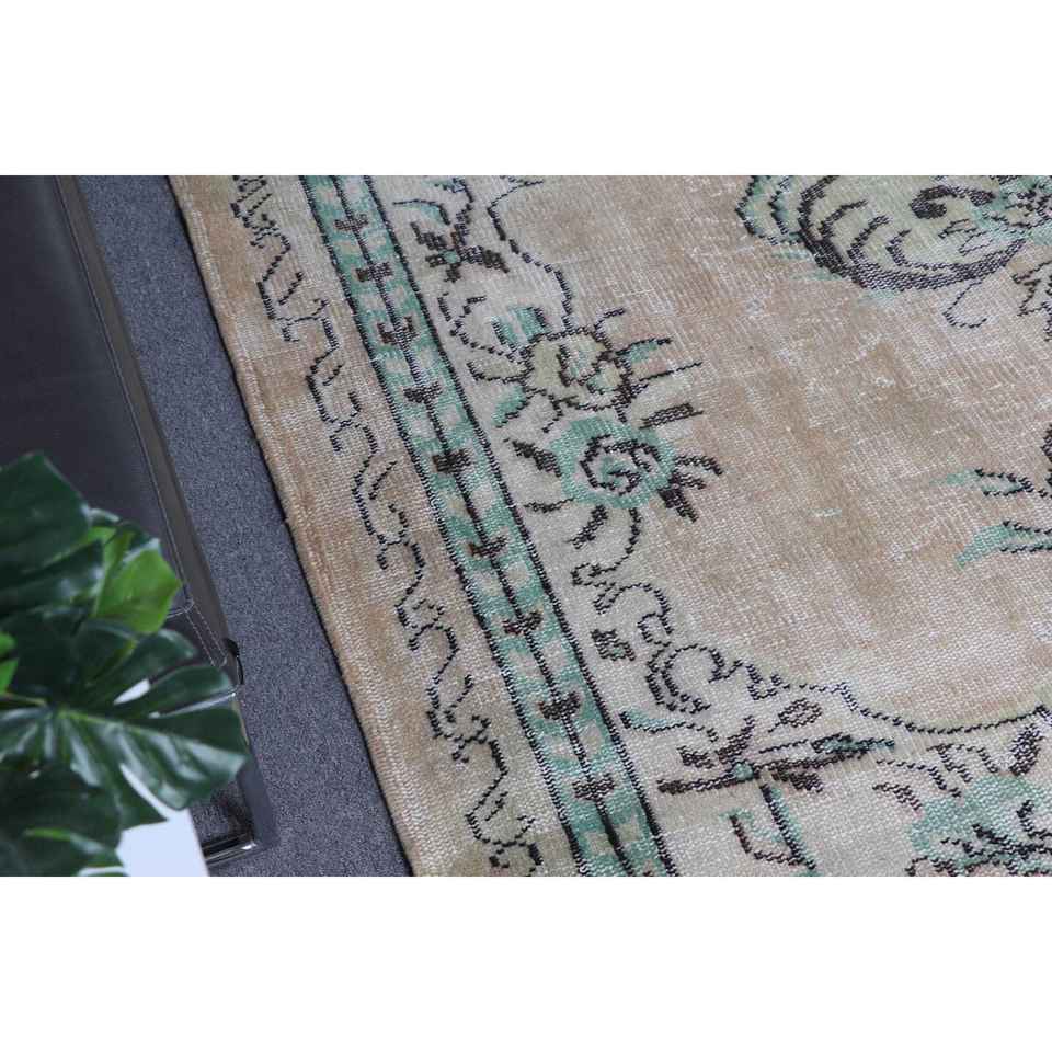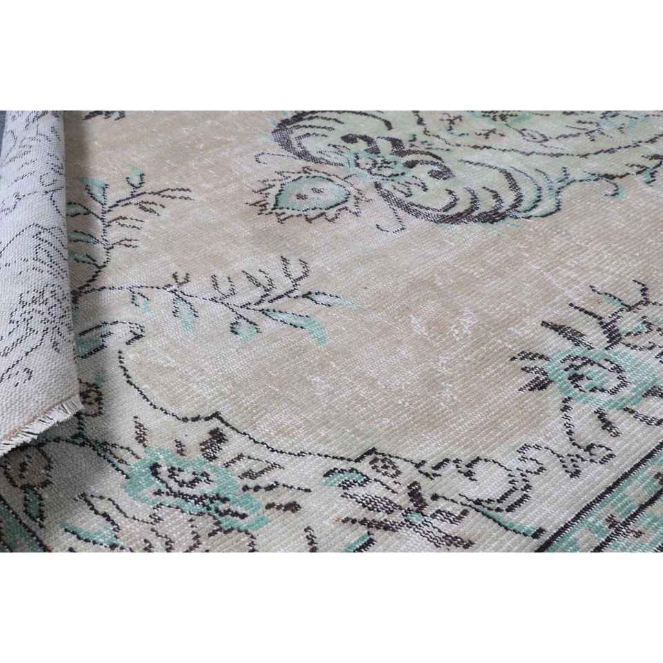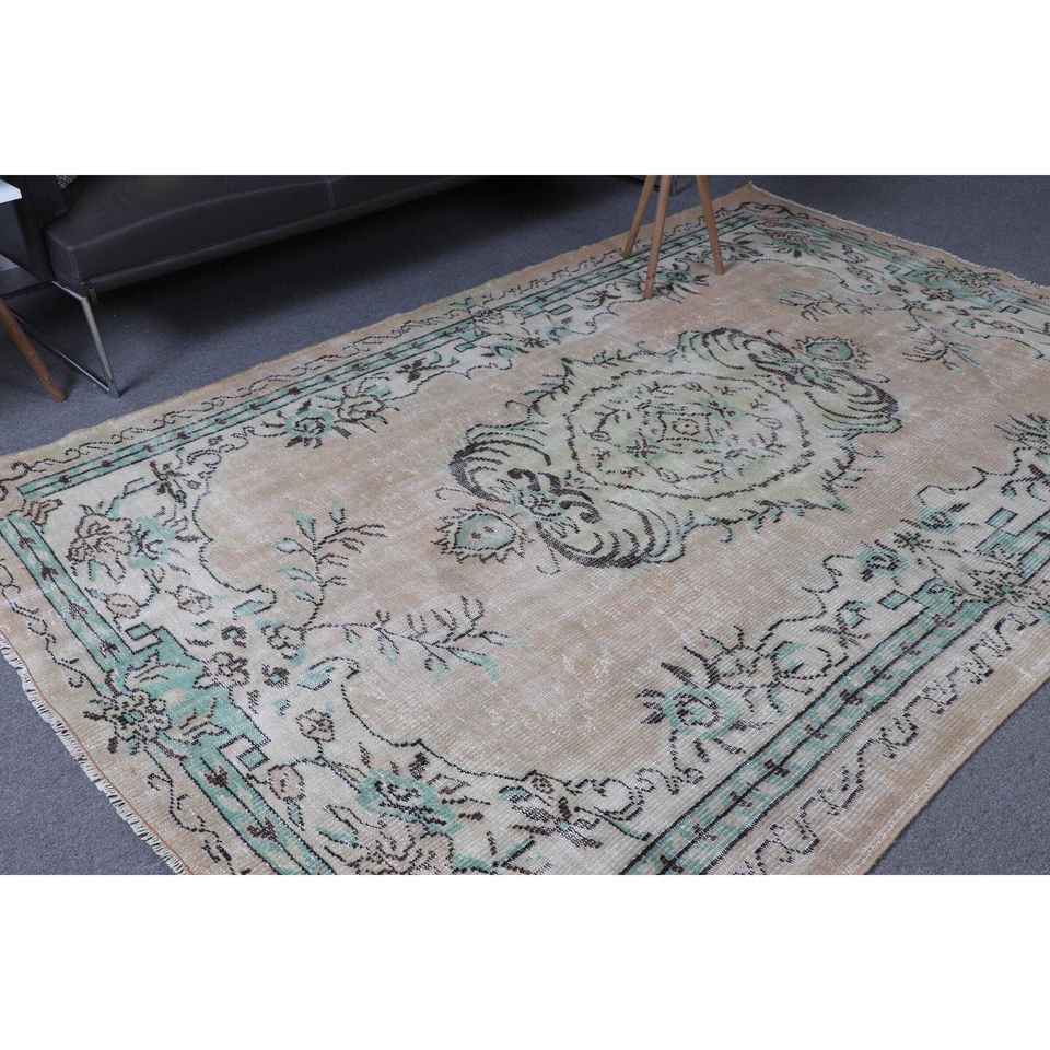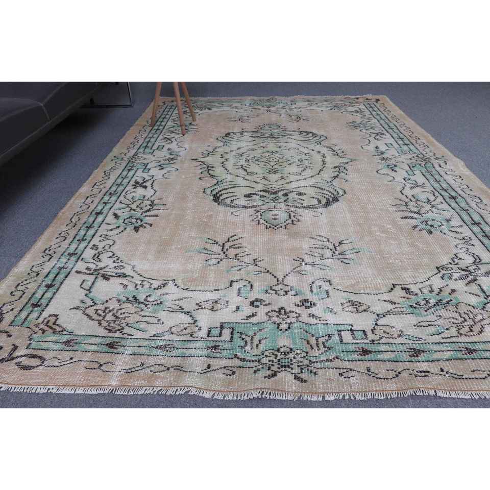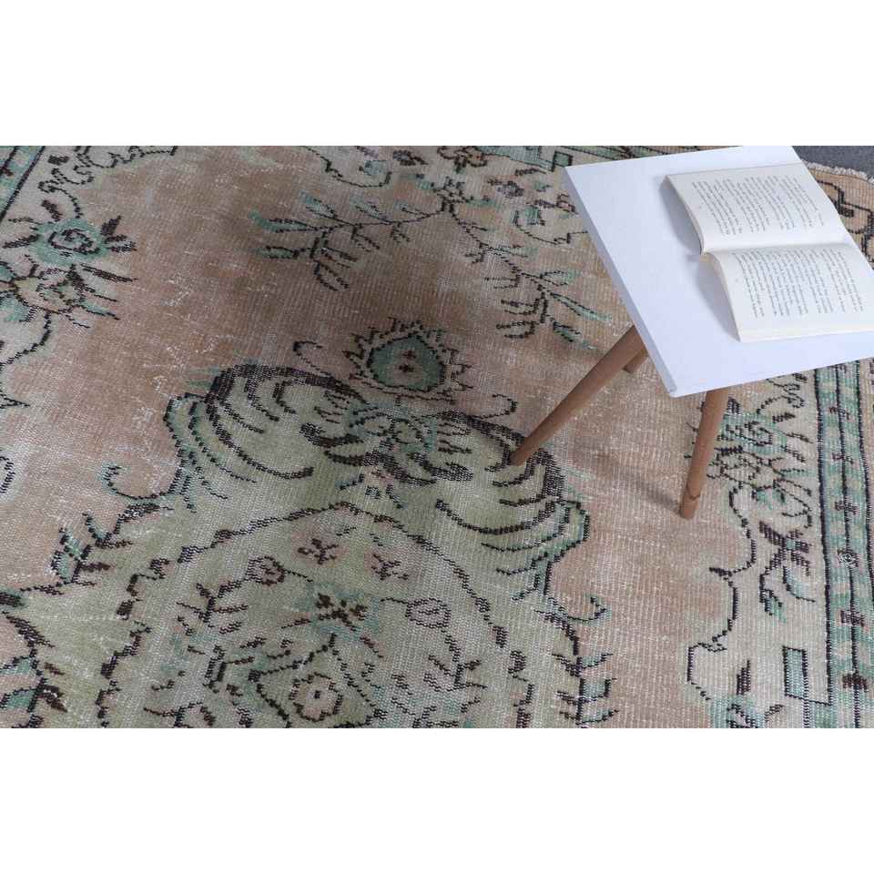 พรมตุรกี ขนาด 6.3x8.9 ฟุต สีน้ำตาลเขียว ลายดอกไม้ ทำจากขนสัตว์ วินเทจ