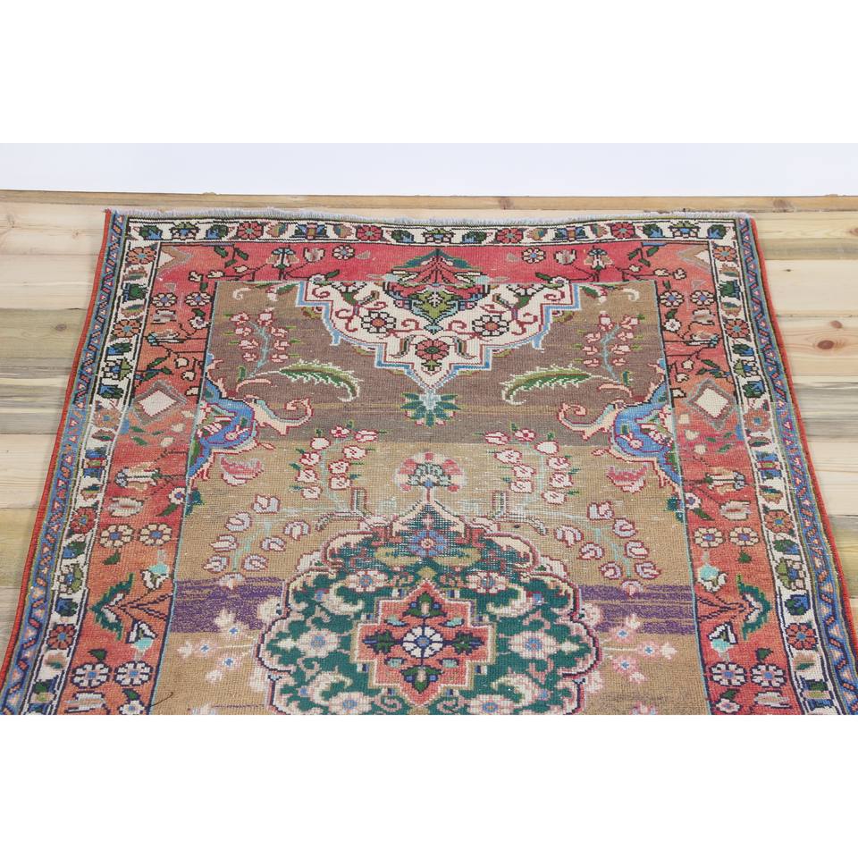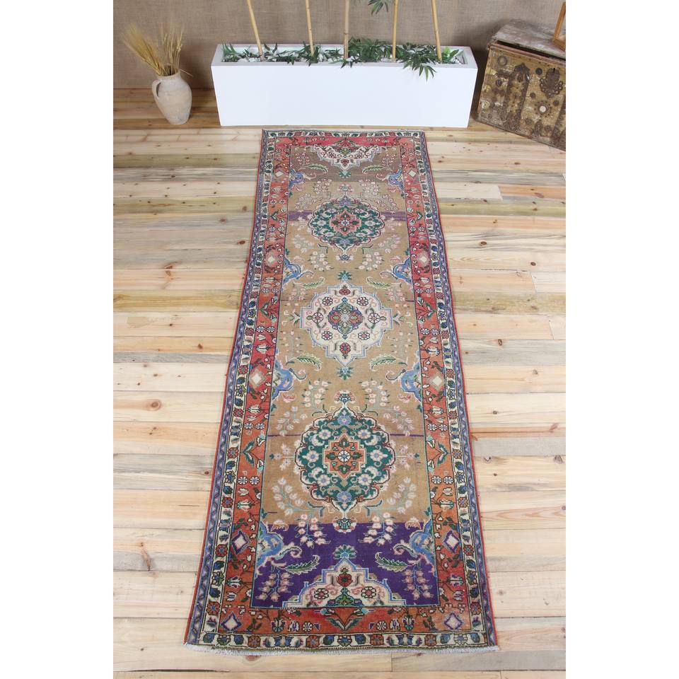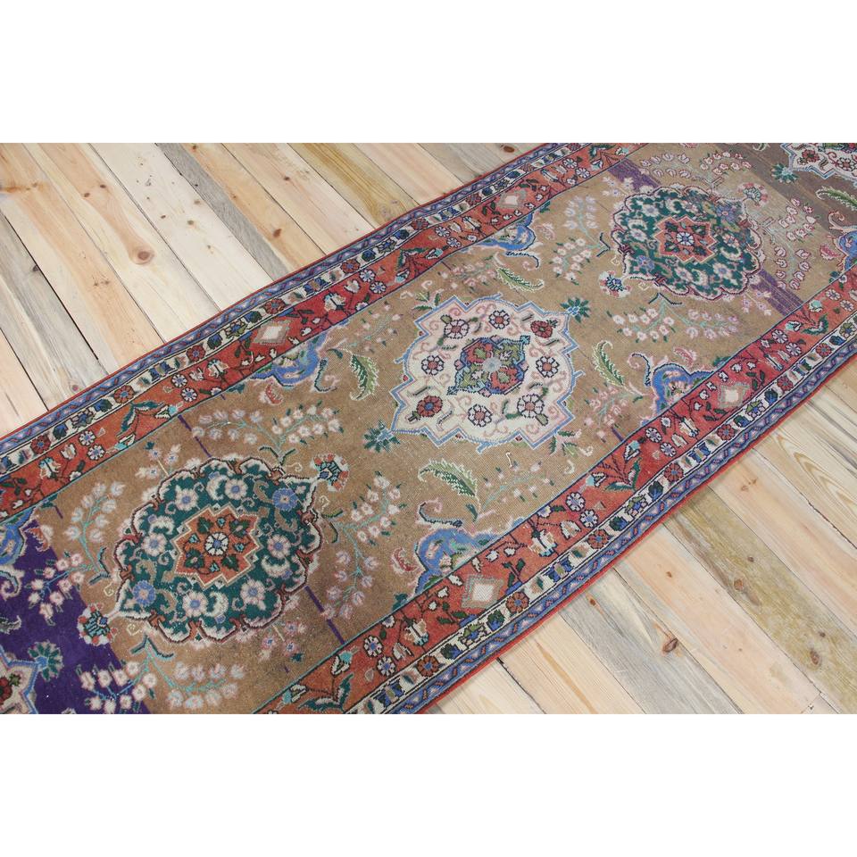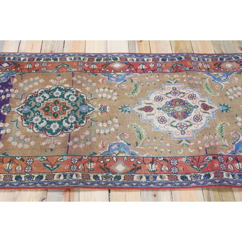พรมวิ่งสไตล์ตุรกี ขนาด 3.1x9.5 ฟุต ลายดอกไม้สีรุ้ง วินเทจ ทำจากขนสัตว์