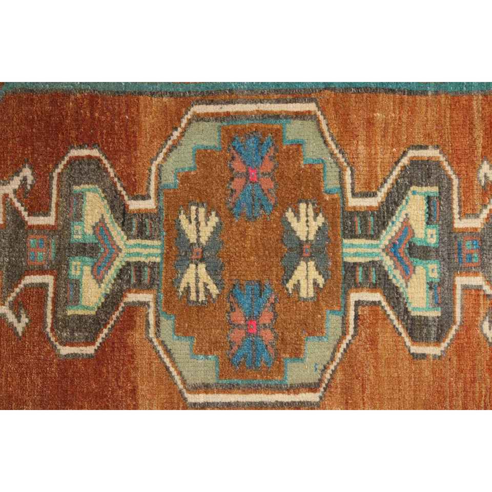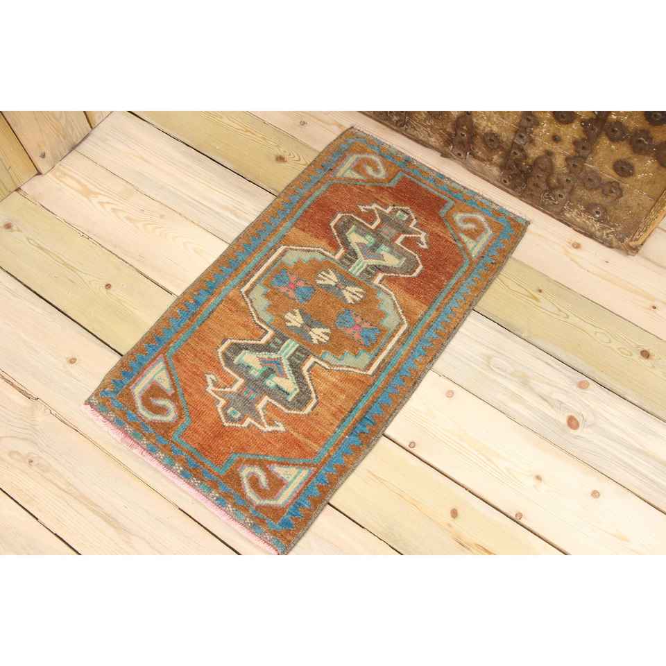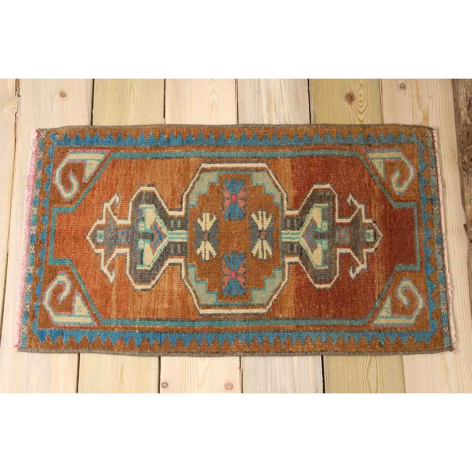 พรมตุรกีขนาดเล็ก 1.4x2.5 ฟุต สีน้ำตาล-น้ำเงินลายพราง ทำจากขนสัตว์