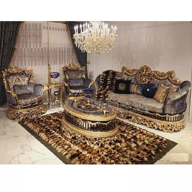 ชุดโซฟาไม้สักแกะสลักสไตล์ตุรกี 5 ที่นั่ง ชุดโซฟาไม้สักขัดเงาสีทอง สำหรับบ้าน ชุดห้องนั่งเล่นแกะสลักสีทองแบบราชวงศ์ สไตล์อเมริกัน