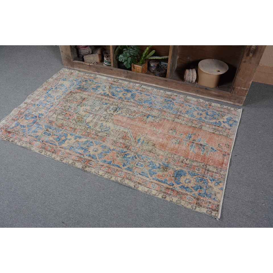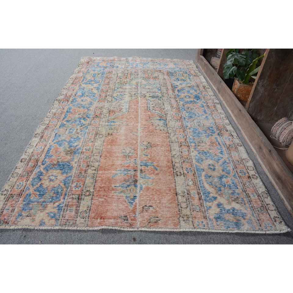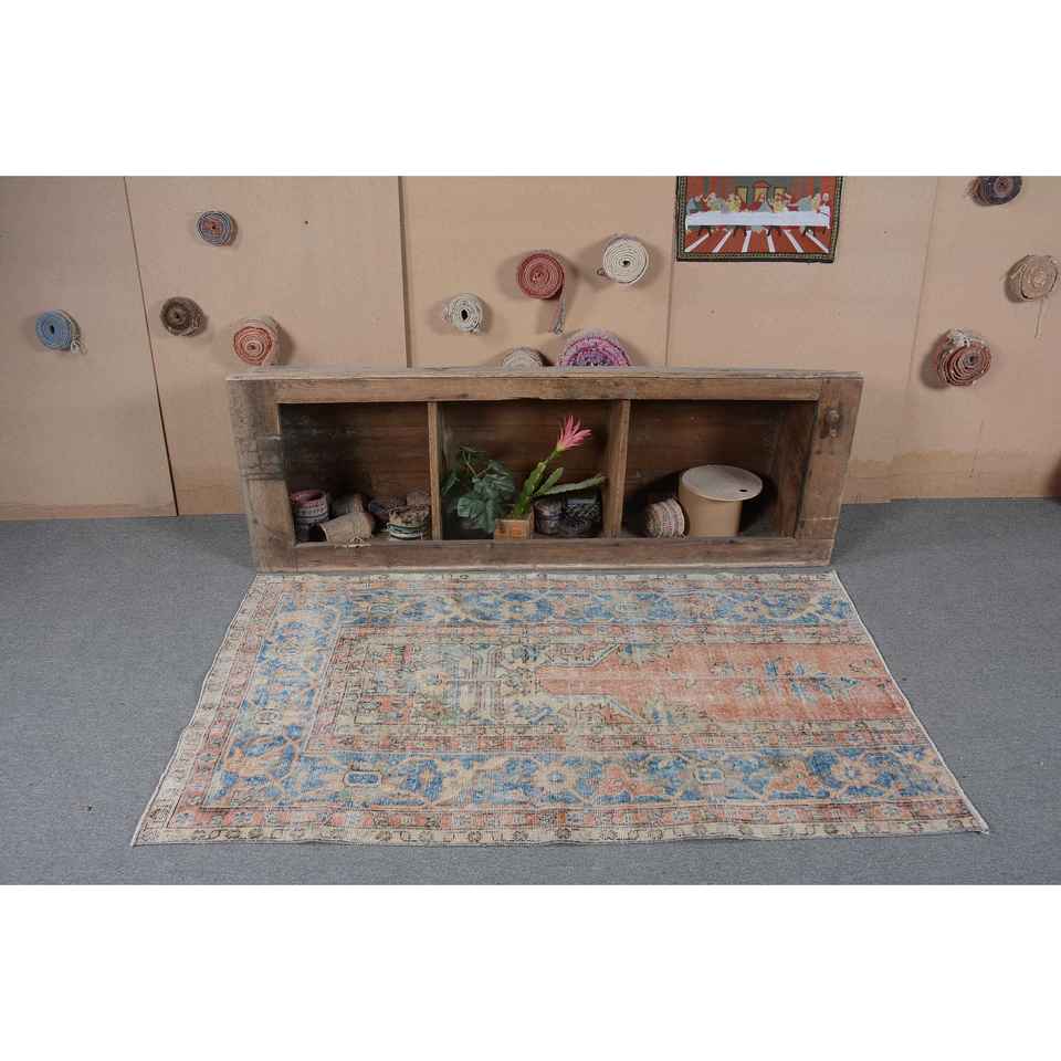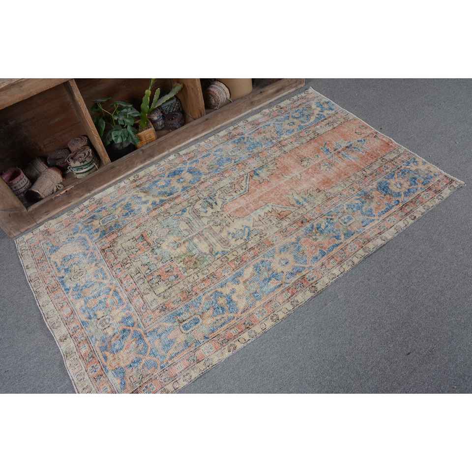 พรมวินเทจสไตล์ตุรกี ขนาด 3.4x5.8 ฟุต สีน้ำเงินส้ม ลายต้นไม้และพืช พรมขนสัตว์