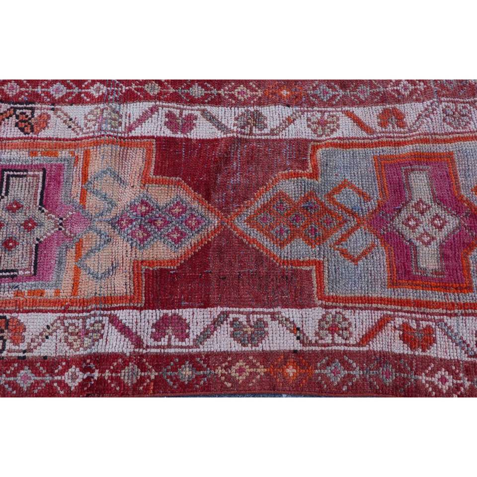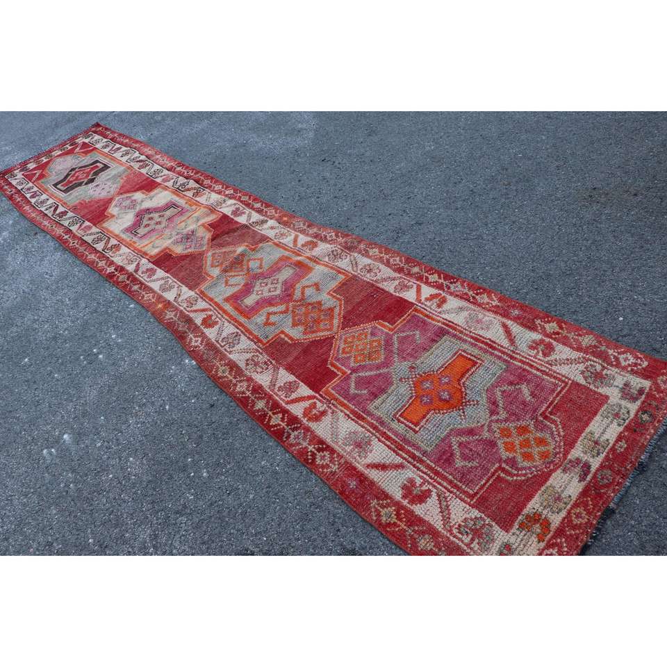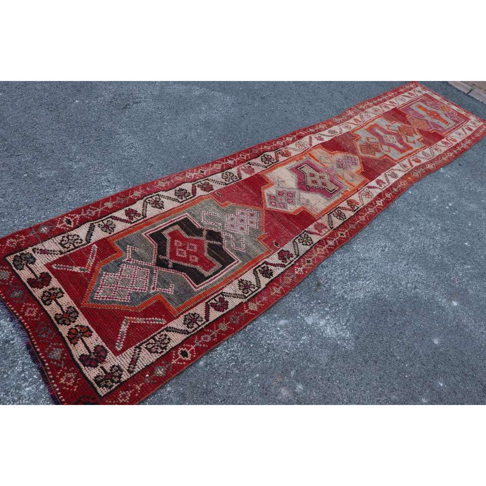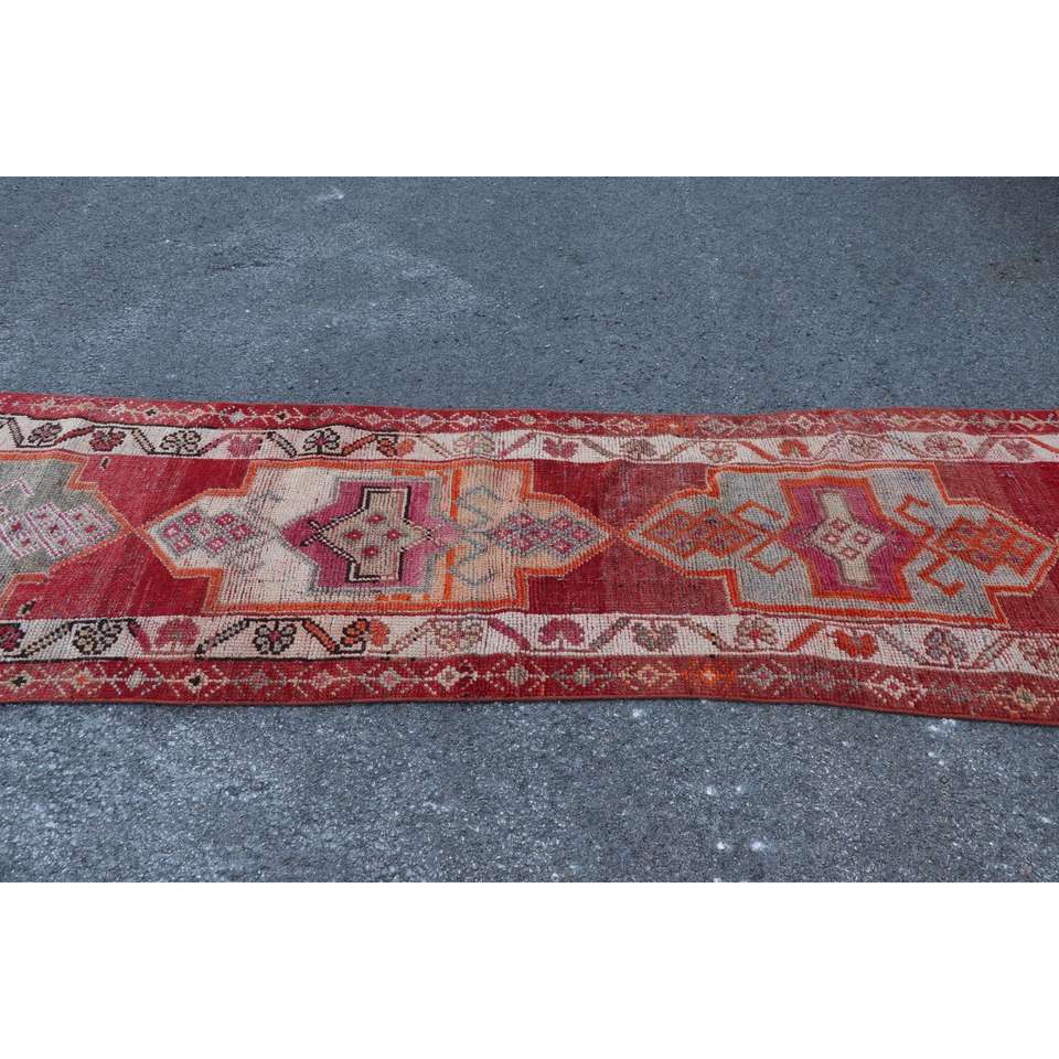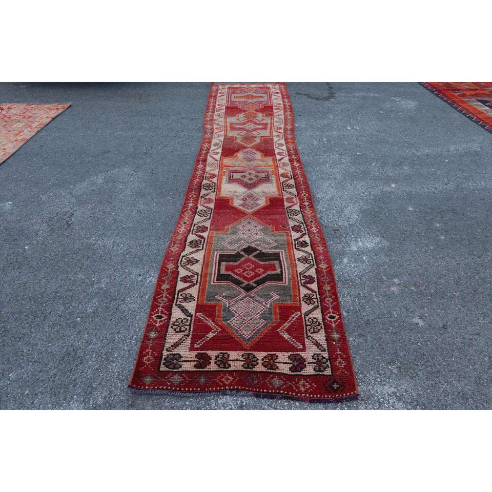 พรมวินเทจตุรกีลายเฮอร์กี ขนาด 2.7x13.3 ฟุต สีแดงลายทาง ทำจากขนสัตว์