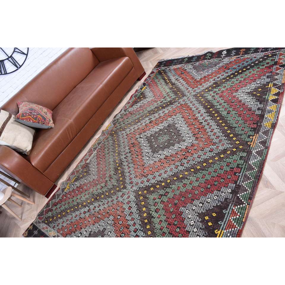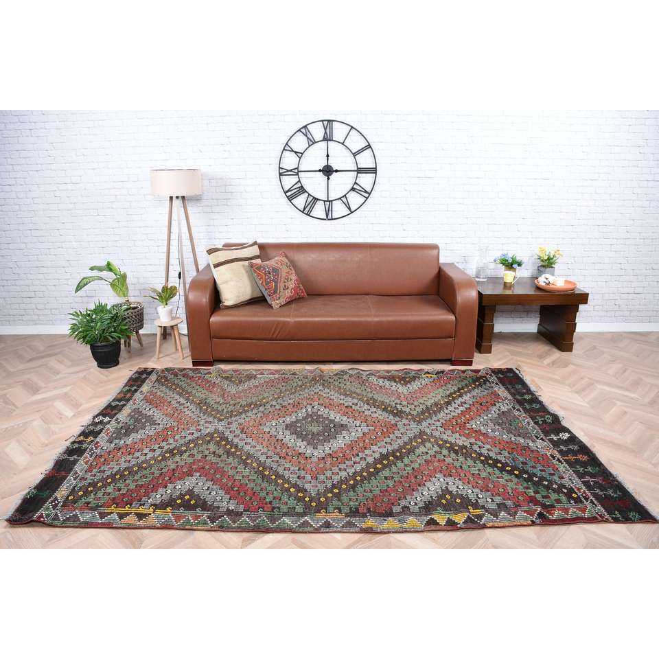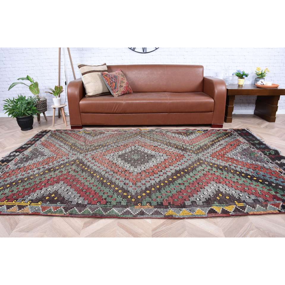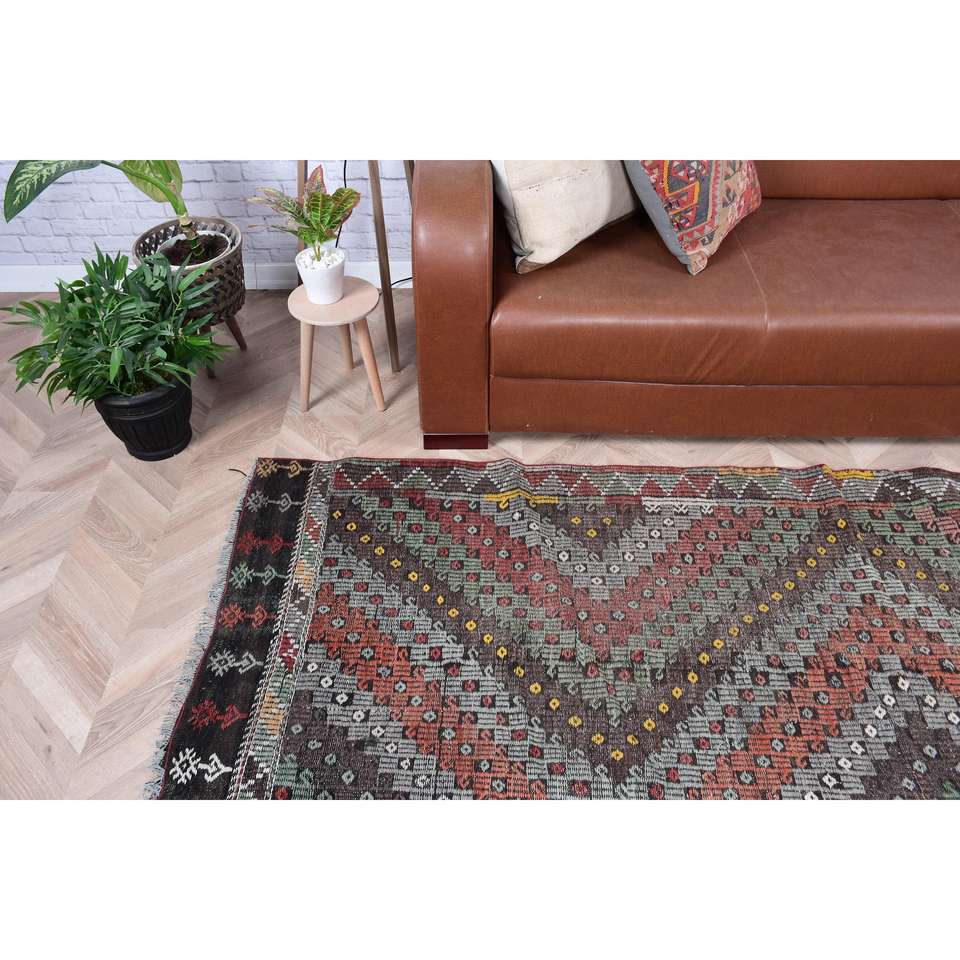 พรมคิลิมวินเทจสไตล์ตุรกี ขนาด 5.5x8.7 ฟุต (167x264 ซม.) พรมขนสัตว์ลายสัตว์สีน้ำตาล