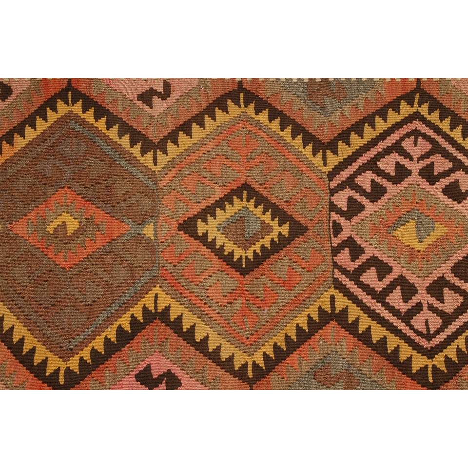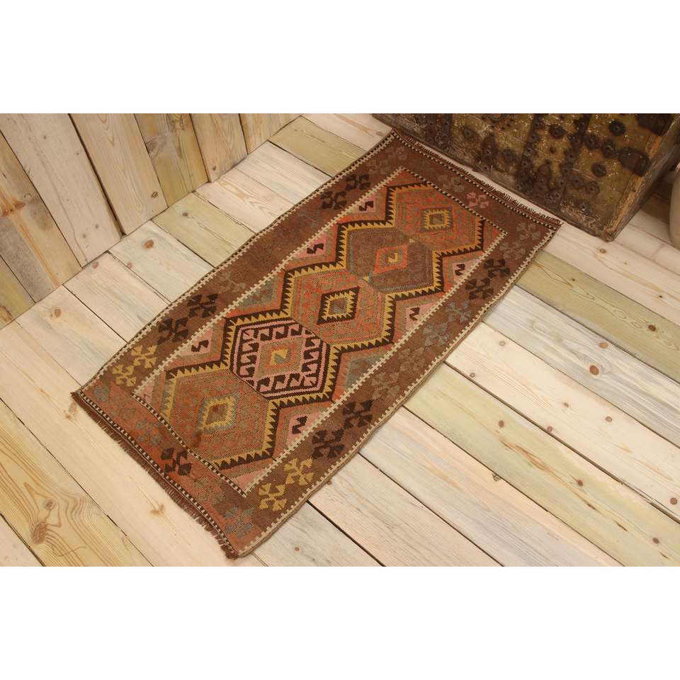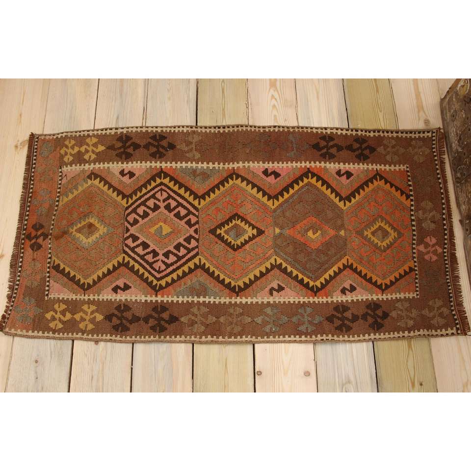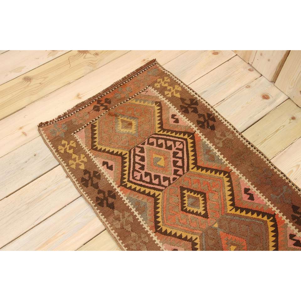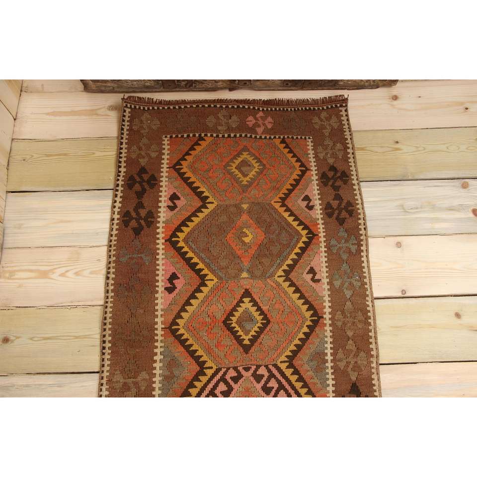 พรมวินเทจสไตล์ตุรกี ขนาด 1.9x3.6 ฟุต ลายต้นไม้และพืชสีน้ำตาลขนาดเล็ก