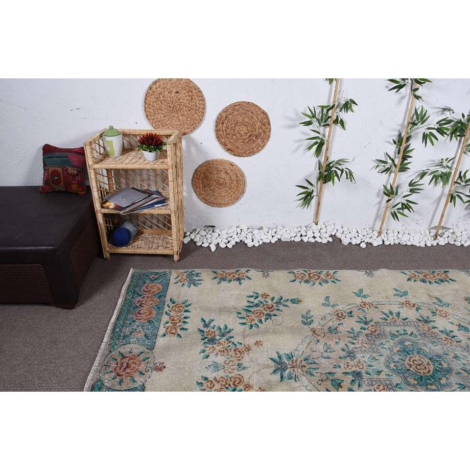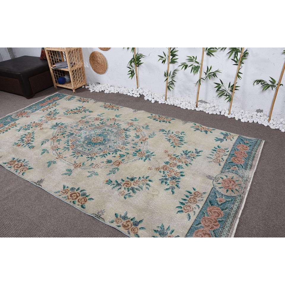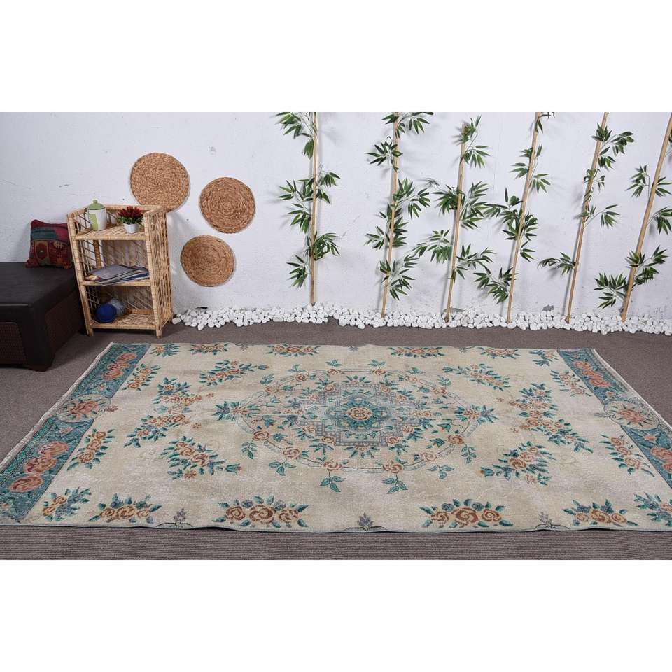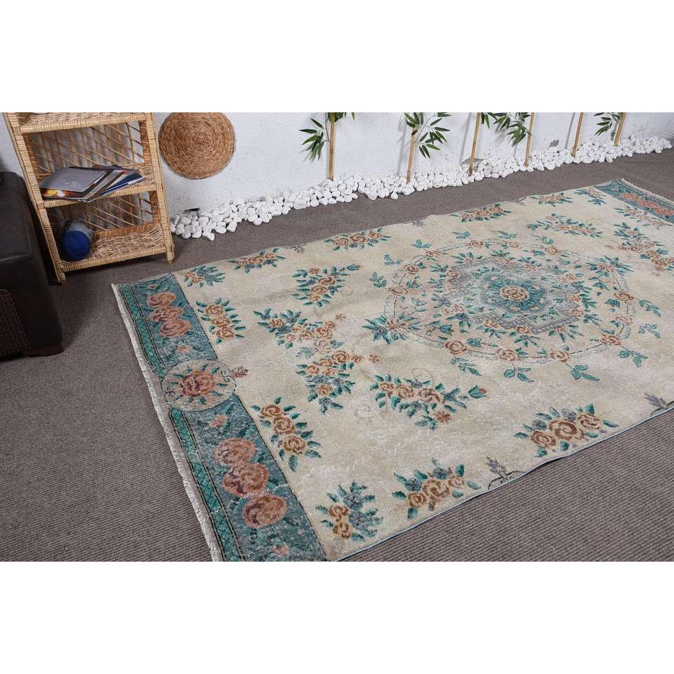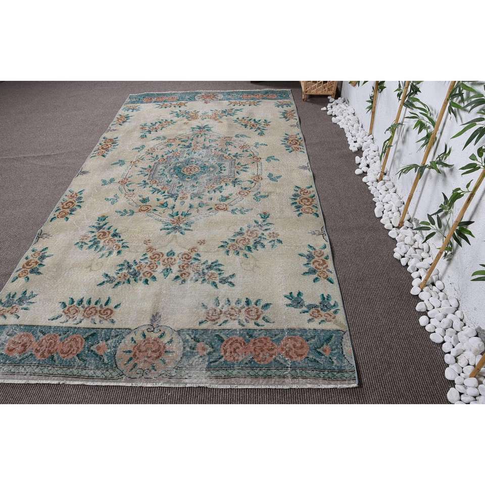 พรมวินเทจตุรกี ขนาด 5.3x10 ฟุต พรมขนาดใหญ่ สีเบจ-น้ำเงิน ลายอิคัต ทำจากขนสัตว์