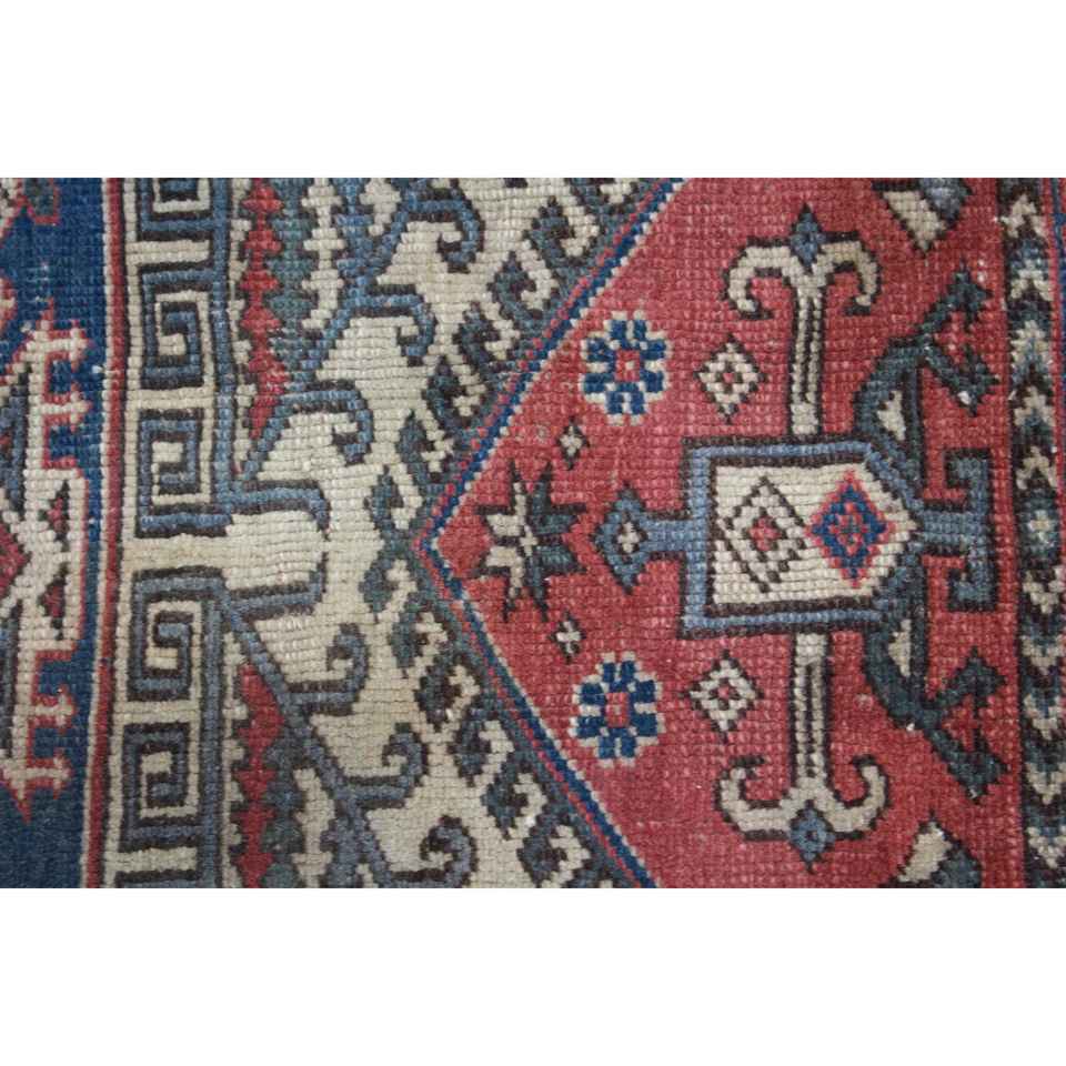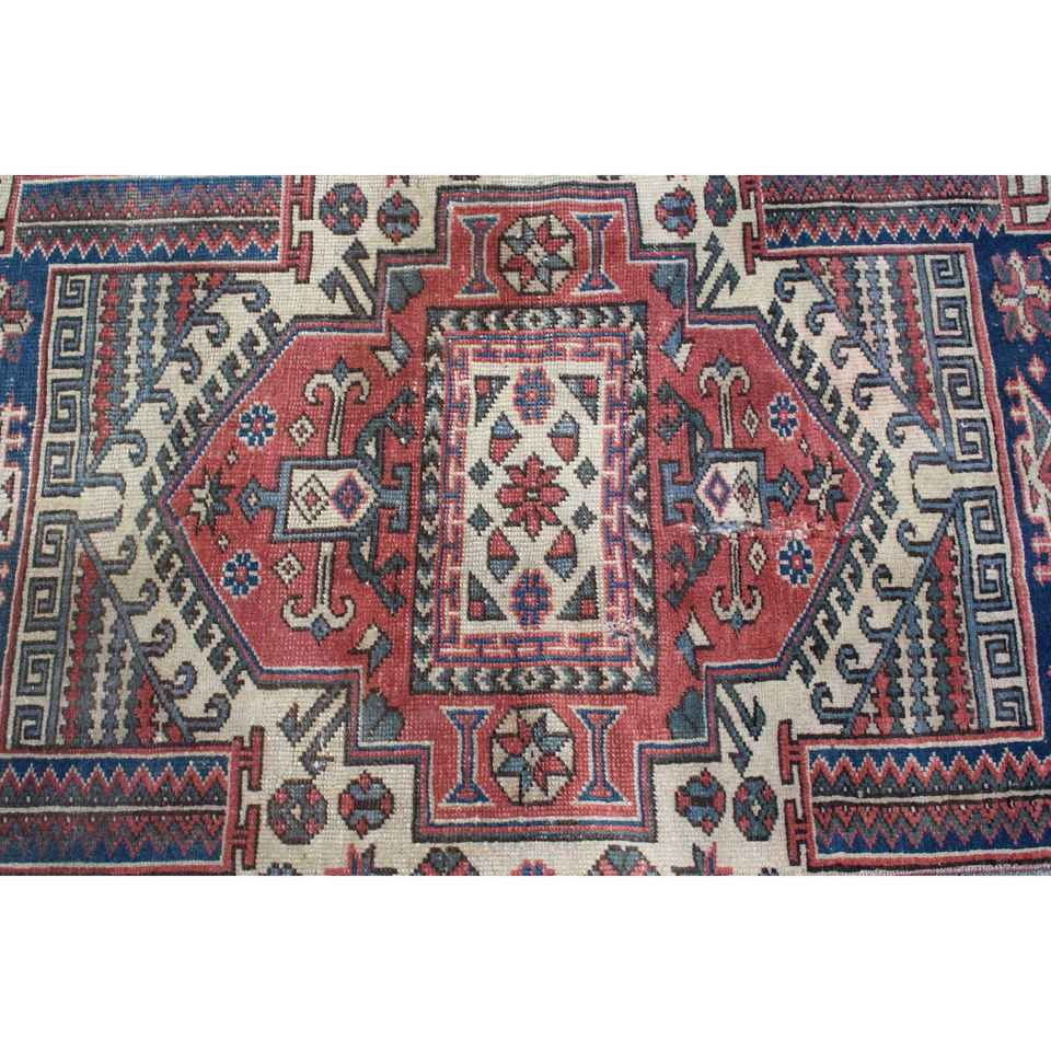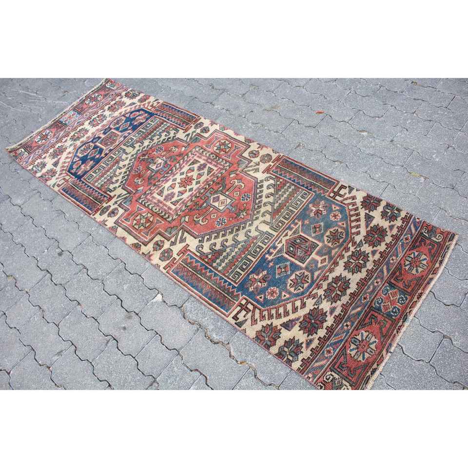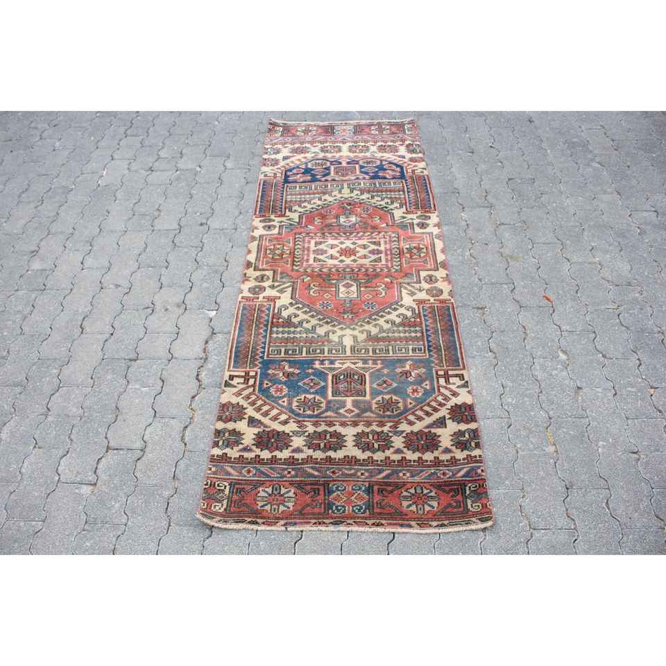 พรมวินเทจสไตล์ตุรกี ขนาด 2.3x6.5 ฟุต สีแดงน้ำเงินลายจุด ทำจากขนสัตว์
