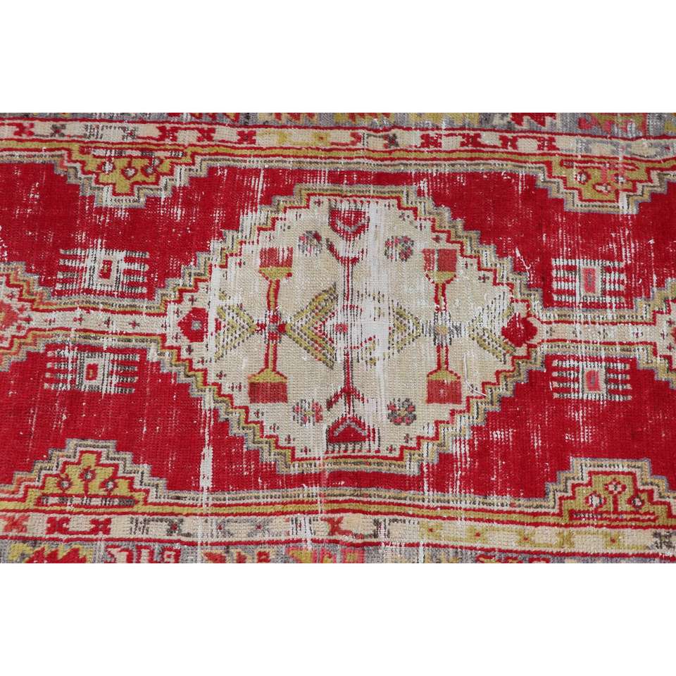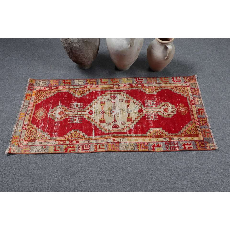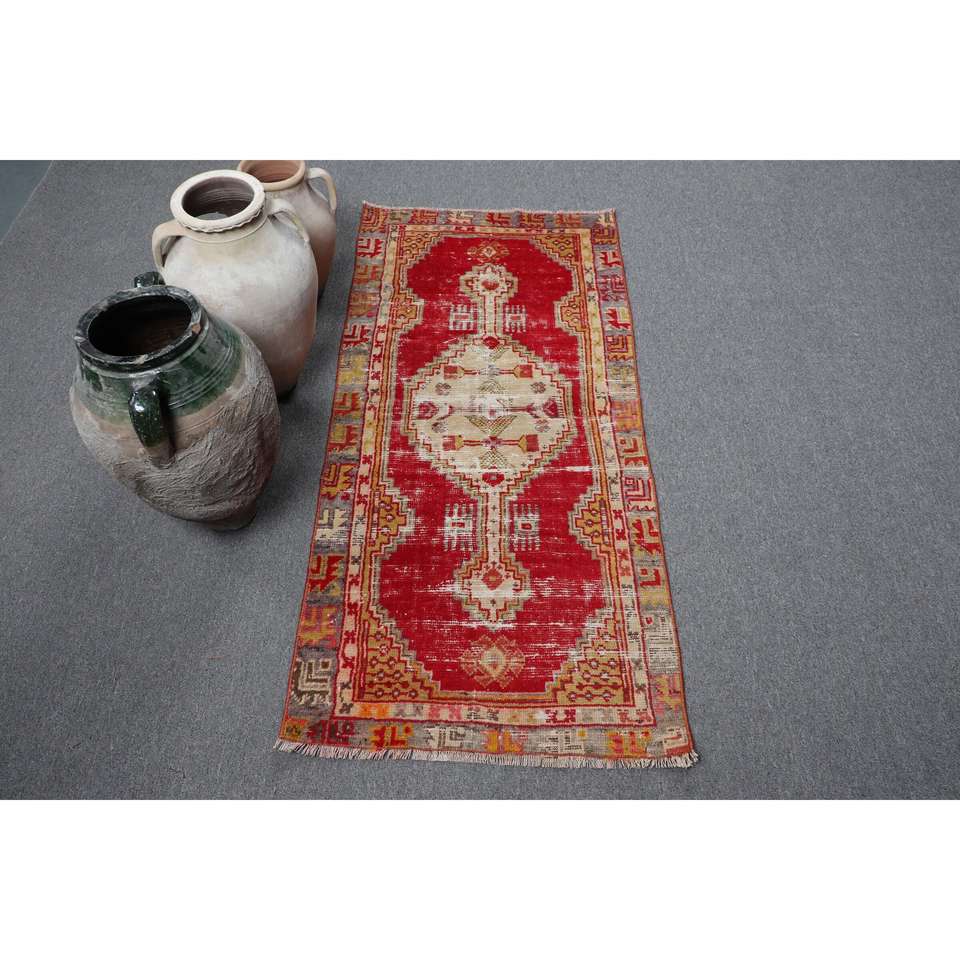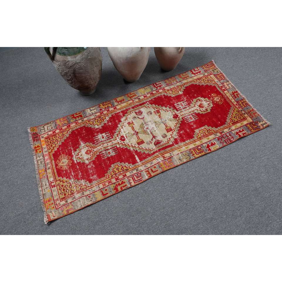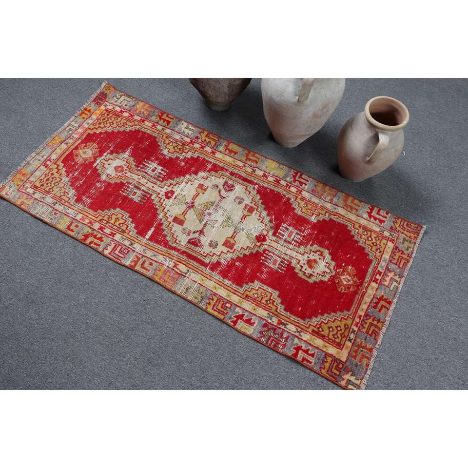 พรมวินเทจตุรกีขนาดเล็ก 2.2x4.8 ฟุต สีแดงขอบเหลือง